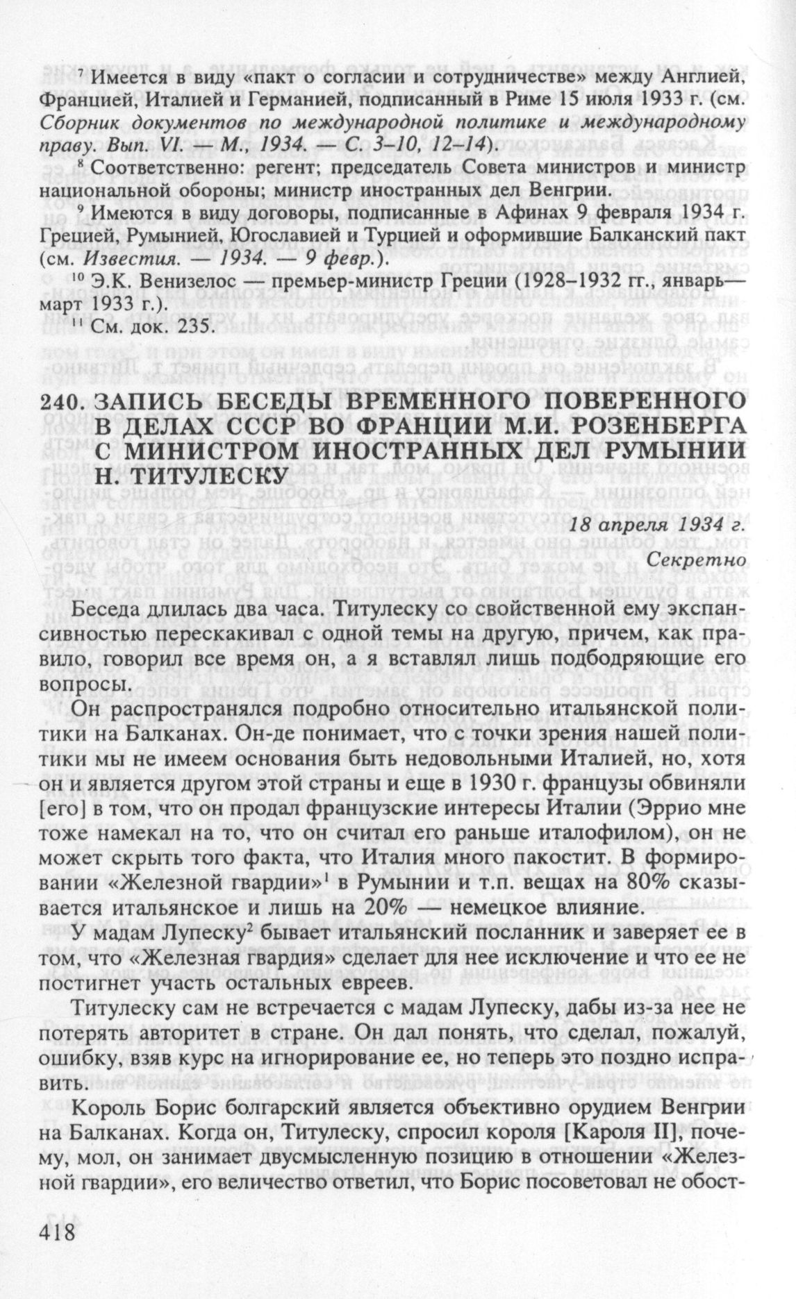 Запись беседы временного поверенного в делах СССР во Франции М.И. Розенберга с министром иностранных дел Румынии Н. Титулеску. 18 апреля 1934 г. // АВП РФ, ф. 136, oп. 1, п. 161, д. 796, л. 233-236. Опубл.: ДВП СССР, т. XVII, док. 132.