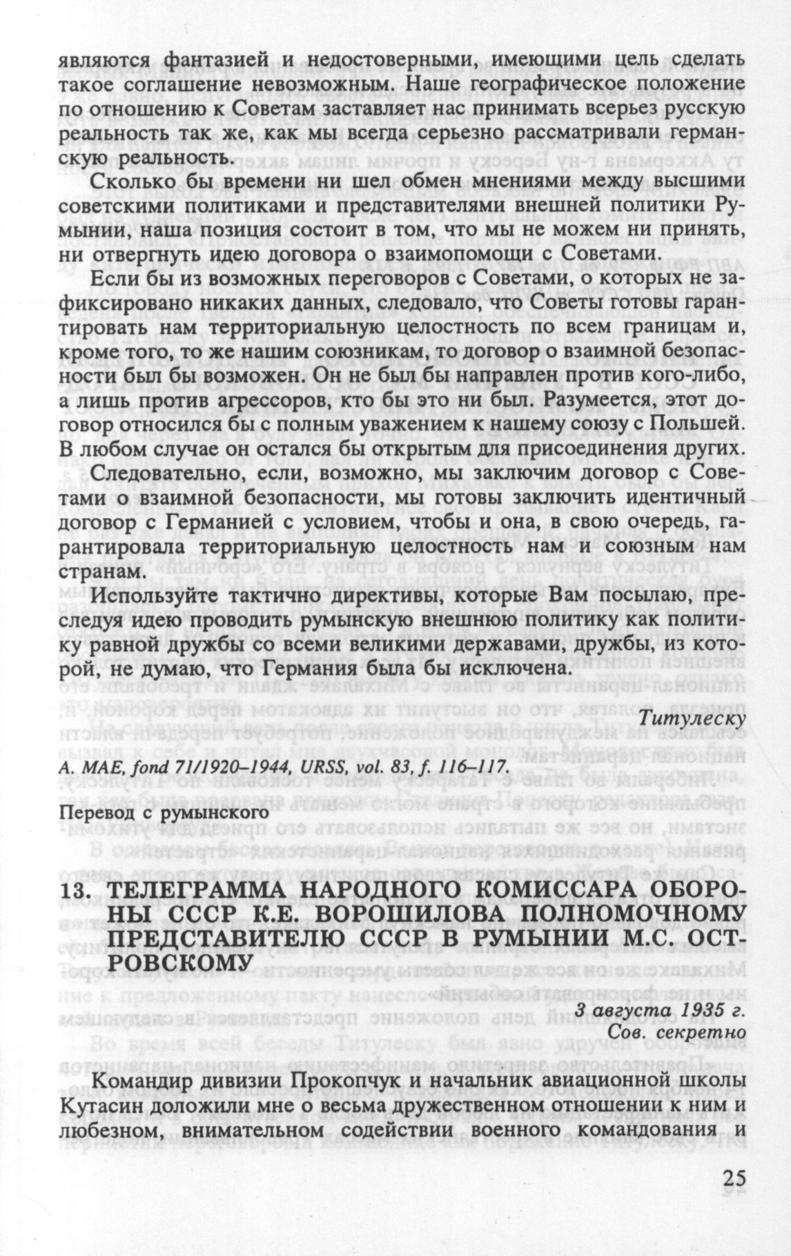 Телеграмма народного комиссара обороны СССР К.Е. Ворошилова полномочному представителю СССР в Румынии М.С. Островскому. 3 августа 1935 г. // АВП РФ, ф. 059, oп. 1, п. 187, д. 1392, л. 133. Опубл.: ДВП СССР, т. XVIII, док. 334.