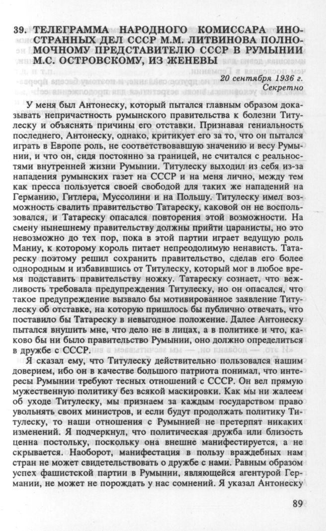 Телеграмма народного комиссара иностранных дел СССР М.М. Литвинова полномочному представителю СССР в Румынии М.С. Островскому, из Женевы. 20 сентября 1936 г. // АВП РФ. ф. 059, oп. 1, п. 214, д. 1549, л. 171—173. Опубл.: ДВП СССР, т. XIX, М,. 1974, док. 273.