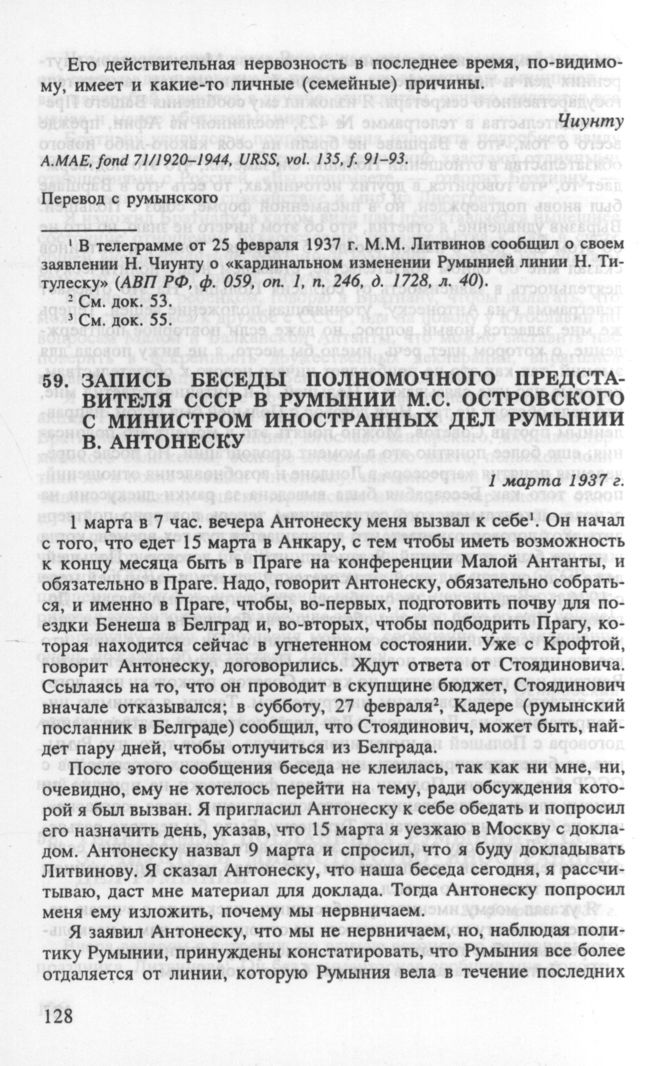 Запись беседы полномочного представителя СССР в Румынии М.С. Островского с министром иностранных дел Румынии В. Антонеску. 1 марта 1937 г. // АВП РФ, ф. 05, oп. 17, п. 134, д. 83, л. 139-146. Опубл.: ДВП СССР, т. XX, док. 55.