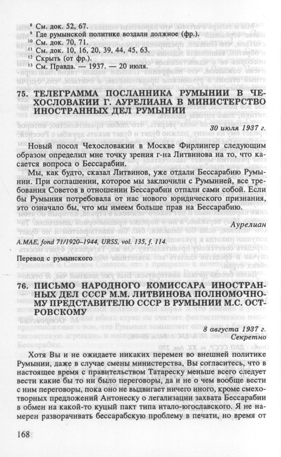 Письмо народного комиссара иностранных дел СССР М.М. Литвинова полномочному представителю СССР в Румынии М.С. Островскому. 8 августа 1937 г. // АВП РФ, ф. 0125, oп. 19, п. 114, д. 2, л. 13-15.