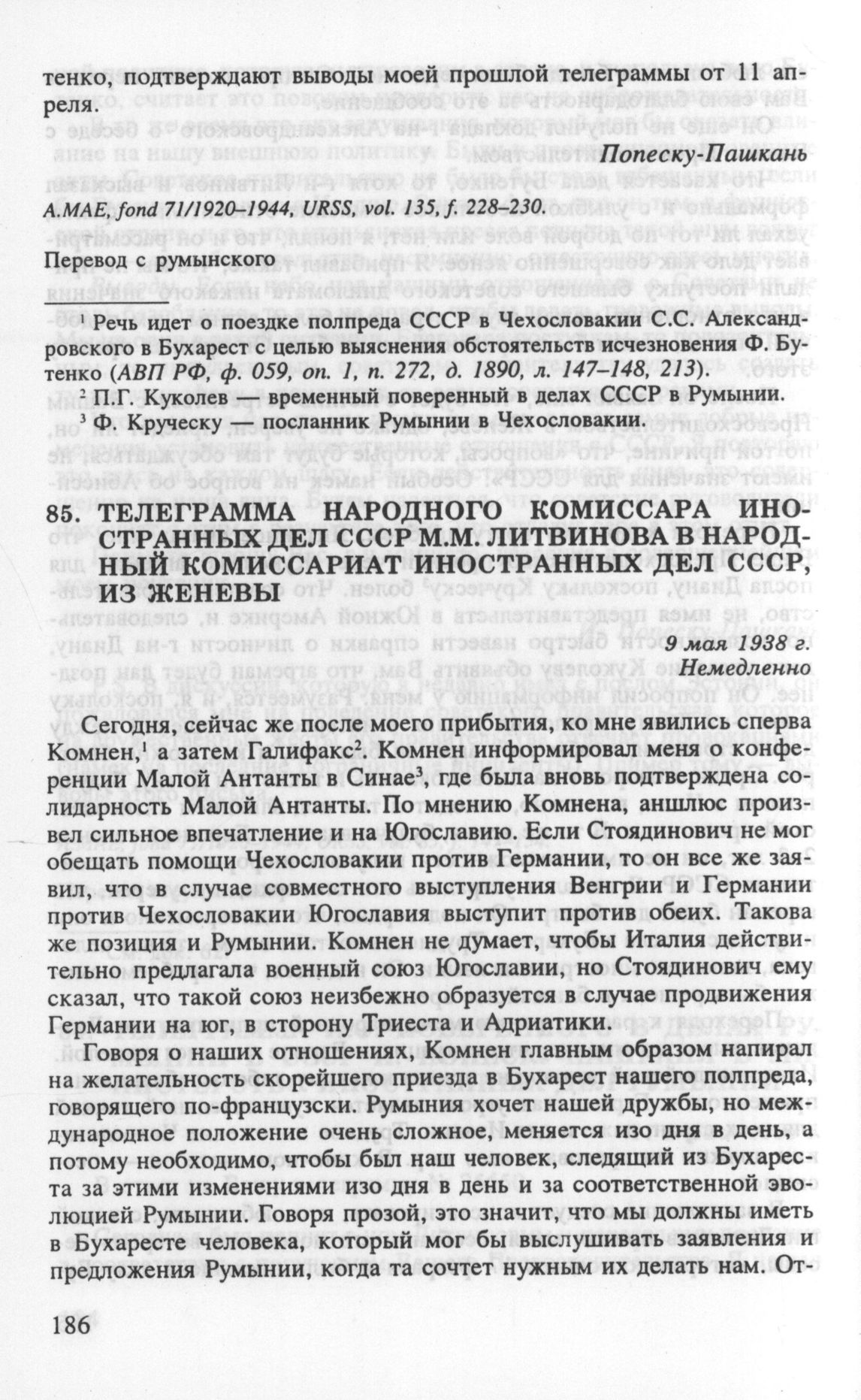 Телеграмма народного комиссара иностранных дел СССР М.М. Литвинова в Народный комиссариат иностранных дел СССР, из Женевы. 9 мая 1938 г. // АВП РФ, ф. 059, oп. 1, п. 275, д. 1907, л. 18-20. Опубл.: ДВП СССР, т. XXI, док. 169.