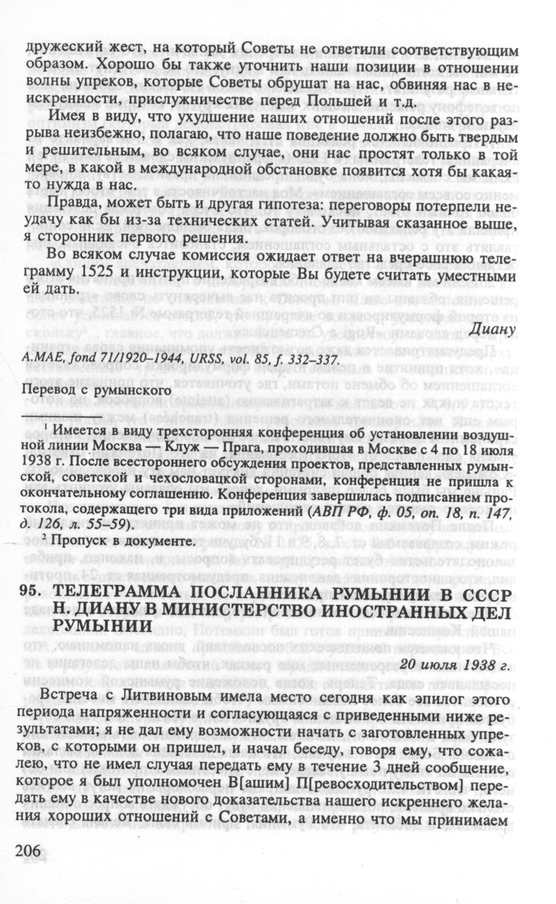Телеграмма посланника Румынии в СССР Н. Диану в Министерство иностранных дел Румынии. 20 июля 1938 г. // А. МАЕ, fond 71/1920-1944, URSS, vol. 85, f. 348-354.