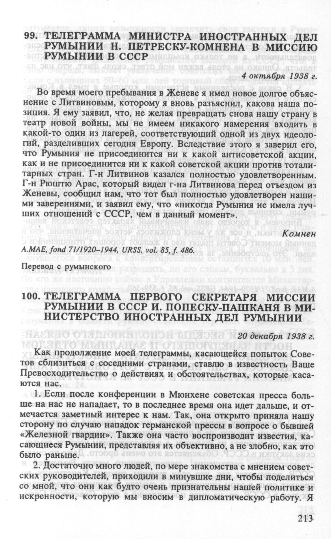 Телеграмма министра иностранных дел Румынии Н. Петреску-Комнена в миссию Румынии в СССР. 4 октября 1938 г. // А.МАЕ. fond 71/1920-1944, URSS, vol. 85, f. 486.