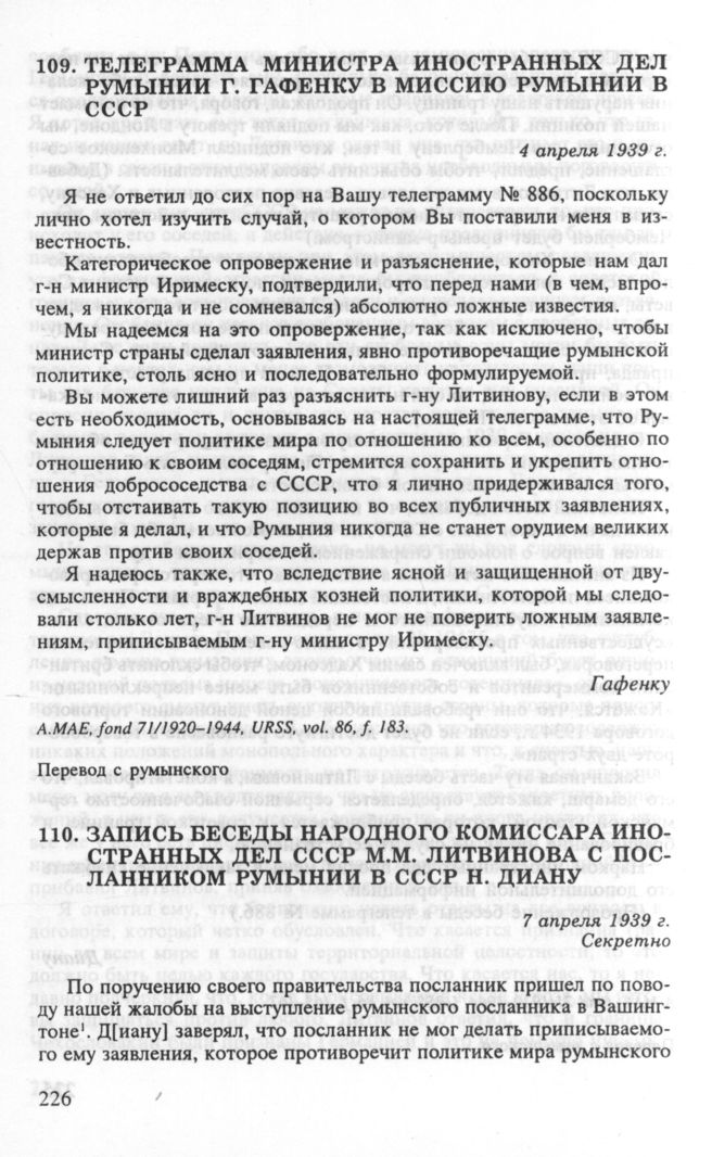 Телеграмма министра иностранных дел Румынии Г. Гафенку в миссию Румынии в СССР. 4 апреля 1939 г. // А.МАЕ, fond 71/1920-1944. URSS, vol. 86, f. 183.