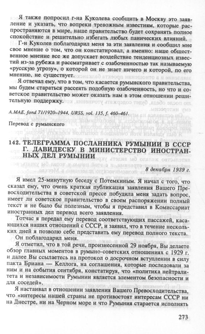 Телеграмма посланника Румынии в СССР Г. Давидеску в Министерство иностранных дел Румынии. 8 декабря 1939 г. // А.МАЕ, fond 71/1920-1944, URSS, vol. 88, f. 283-287.