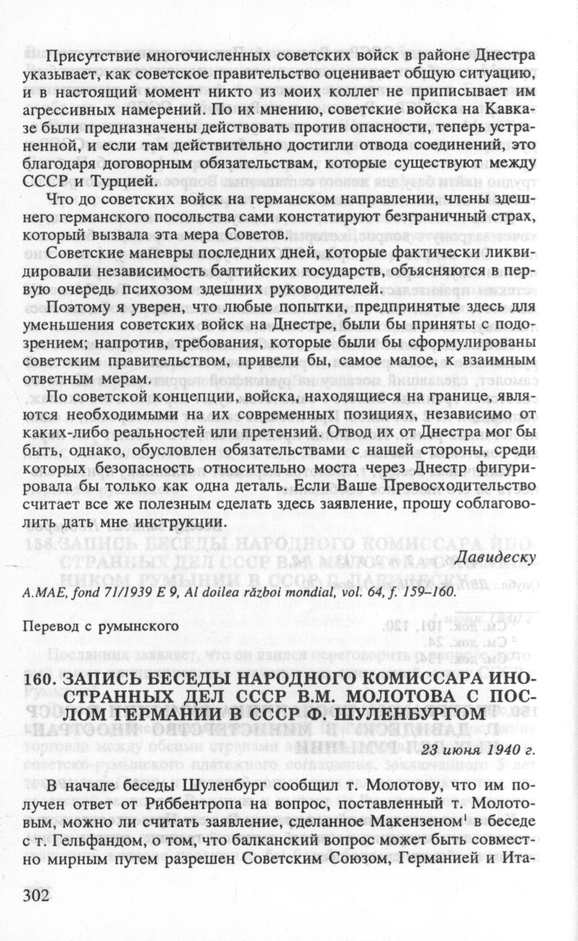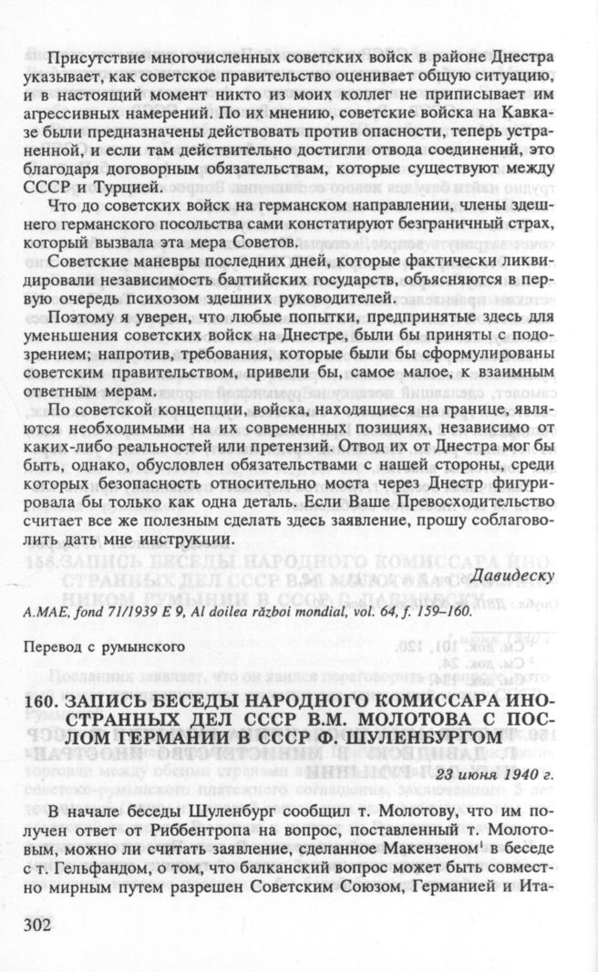 Запись беседы народного комиссара иностранных дел СССР В.М. Молотова с послом Германии в СССР Ф. Шуленбургом. 23 июня 1940 г. // АВП РФ, ф. 06, oп. 2, п. 14, д. 155, л. 209-215. Опубл.: ДВП, т. ХХ111, кн. 1, док. 217.
