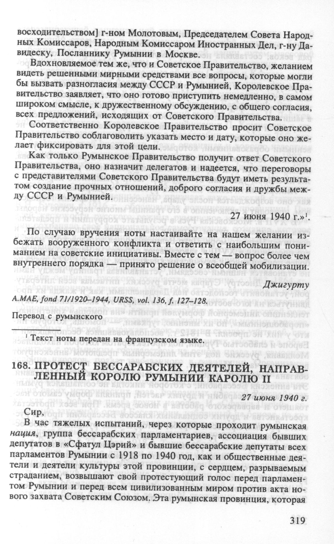 Протест бессарабских деятелей, направленный королю Румынии Каролю II. 27 июня 1940 г.