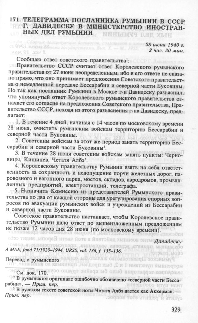 Телеграмма посланника Румынии в СССР Г. Давидеску в Министерство иностранных дел Румынии. 28 июня 1940 г. // А.МАЕ, fond 71/1920-1944, URSS, vol. 136, f. 135-136.