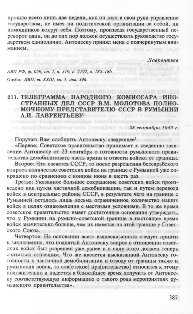 Телеграмма народного комиссара иностранных дел СССР В.М. Молотова полномочному представителю СССР в Румынии А.И. Лаврентьеву. 28 сентября 1940 г. // АВП РФ, ф. 059, oп. 1, п. 319, д. 2195, л. 8-9. Опубл.: ДВП, т. ХХIII, кн. 1, док. 409.