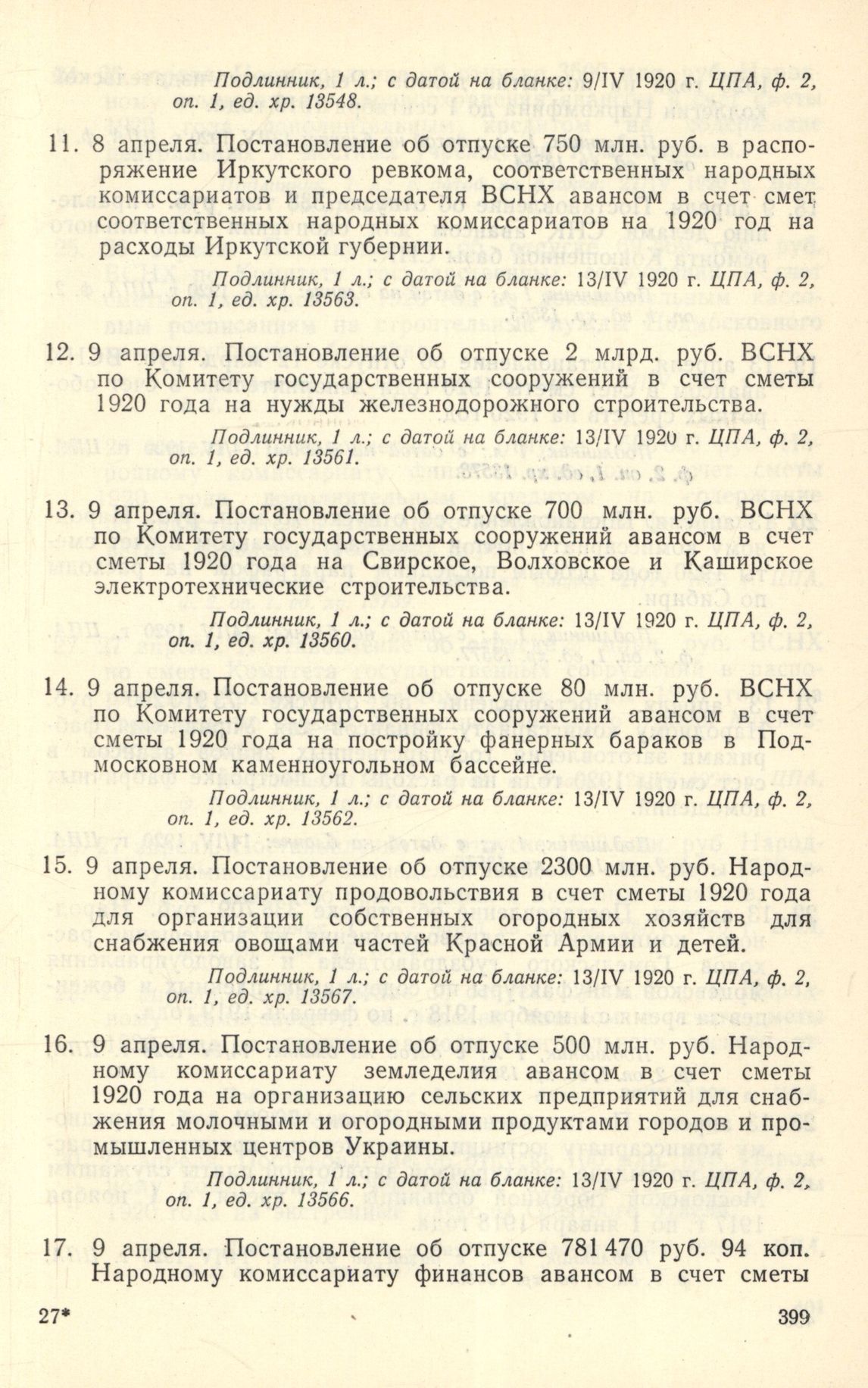 9 апреля. Постановление об отпуске 781 470 руб. 94 коп. Народному комиссариату финансов авансом в счет сметы 1920 года на покрытие долгов Редакционно-издательской коллегии Наркомфина до 1 сентября 1919 года // Подлинник, 1 л.; с датой на бланке: 13/IV 1920 г. ЦПА, ф. 2, оп. 1, ед. хр. 13564.