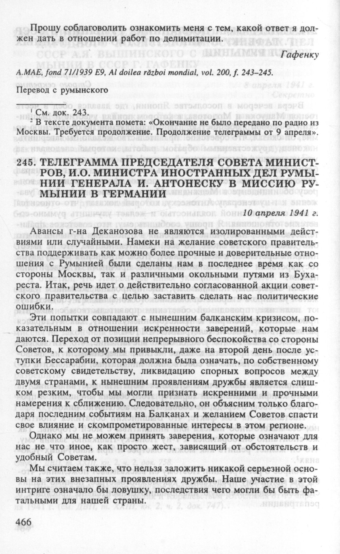 Телеграмма председателя Совета министров Румынии, и.о. министра иностранных дел генерала И. Антонеску в миссию Румынии в Германии. 10 апреля 1941 г. // А.МАЕ, fond 71/1920-1944, URSS, vol. 95, f. 30-31.