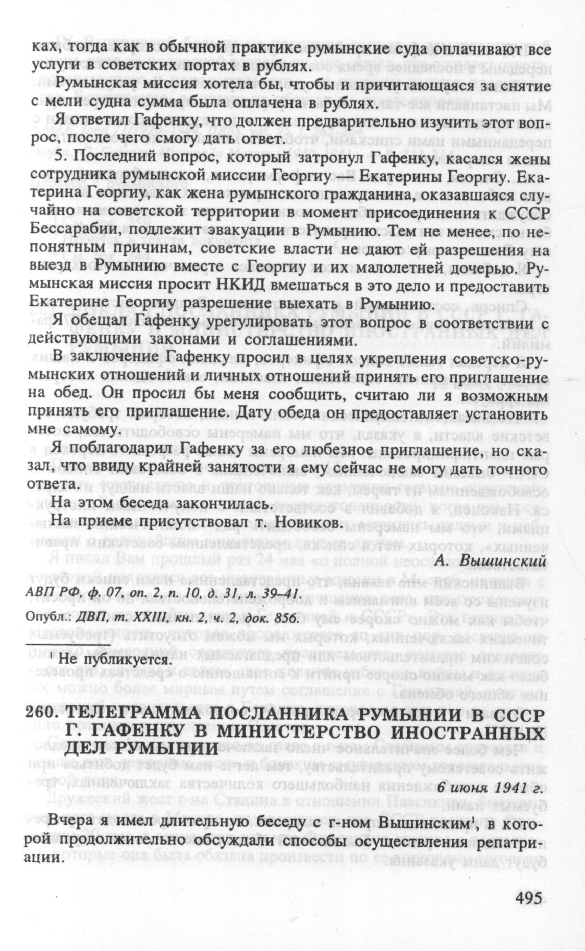 Телеграмма посланника Румынии в СССР Г. Гафенку в Министерство иностранных дел Румынии. 6 июня 1941 г. // А.МАЕ, fond 71/1920-1944, URSS, vol. 95, f. 262-264. Опубл.: G. Gafencu. Misiune la Moscova 1940-1941... — P. 213-214.