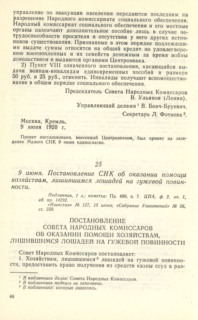 9 июня. Постановление СНК об оказании помощи хозяйствам, лишившимся лошадей на гужевой повинности // Подлинник, 1 л.; пометка: Пр. 490, п. 7. ЦПА, ф. 2, оп. 1, ед. хр. 14292. «Известия» № 127, 13 июня; «Собрание Узаконений» № 56, ст. 250.