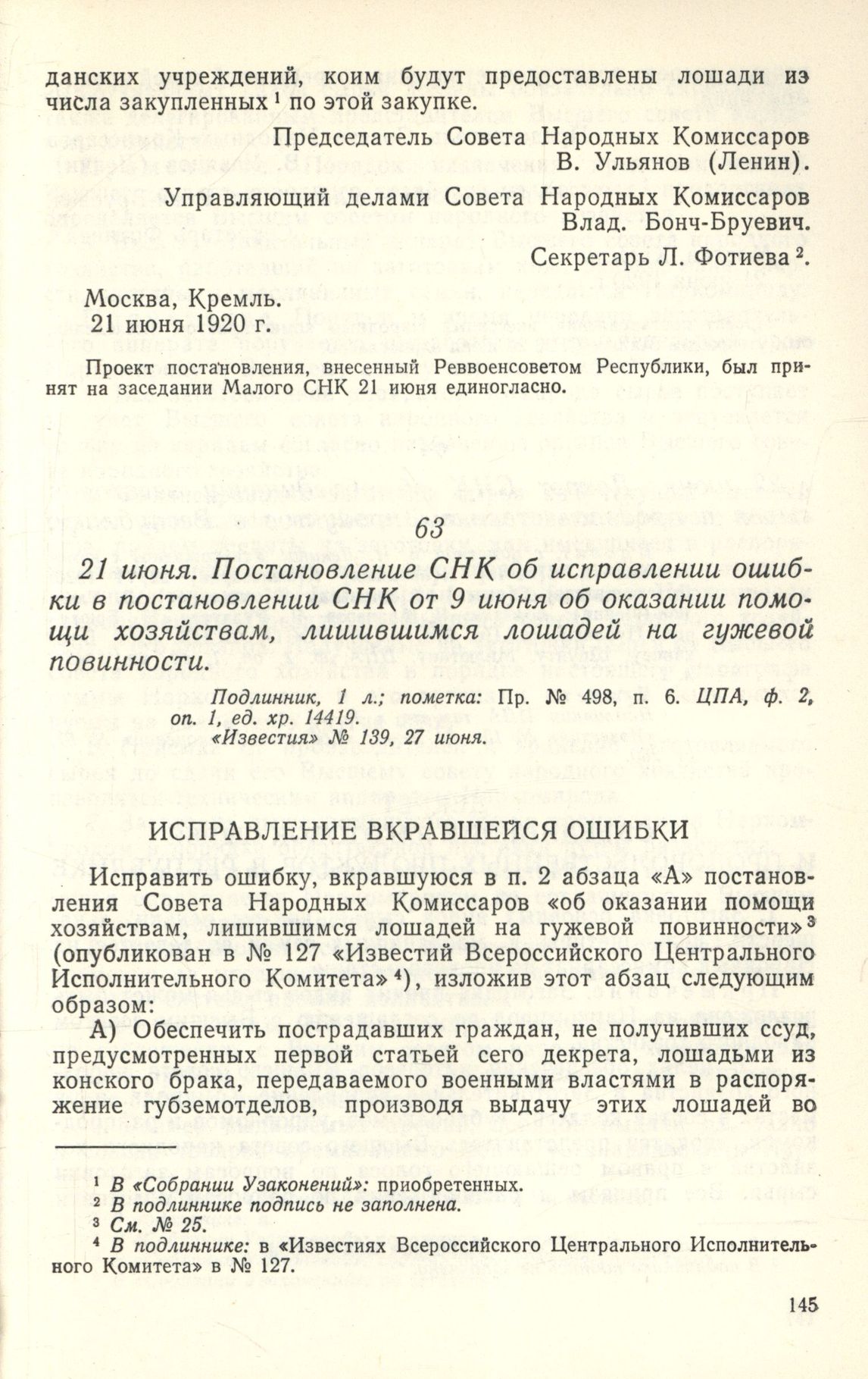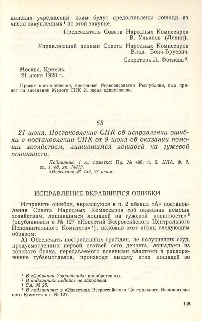 21 июня. Постановление СНК об исправлении ошибки в постановлении СНК от 9 июня об оказании помощи хозяйствам, лишившимся лошадей на гужевой повинности // Подлинник, 1 л.; пометка: Пр. № 498, п. 6. ЦПА, ф. 2, оп. 1, ед. хр. 14419. «Известия» № 139, 27 июня.