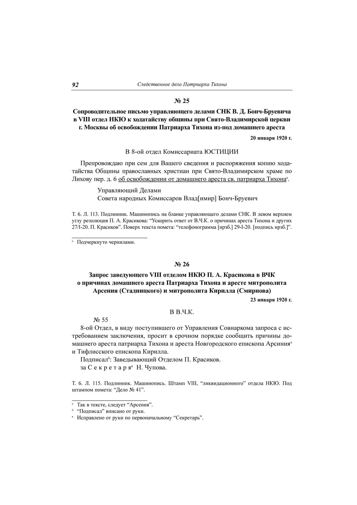 Сопроводительное письмо управляющего делами СНК В. Д. Бонч-Бруевича в VIII отдел НКЮ к ходатайству общины при Свято-Владимирской церкви г. Москвы об освобождении Патриарха Тихона из-под домашнего ареста, 20 января 1920 г. // ЦА ФСБ РФ. Д. Н-1780. Т. 6. Л. 113. Подлинник. Машинопись на бланке управляющего делами СНК.