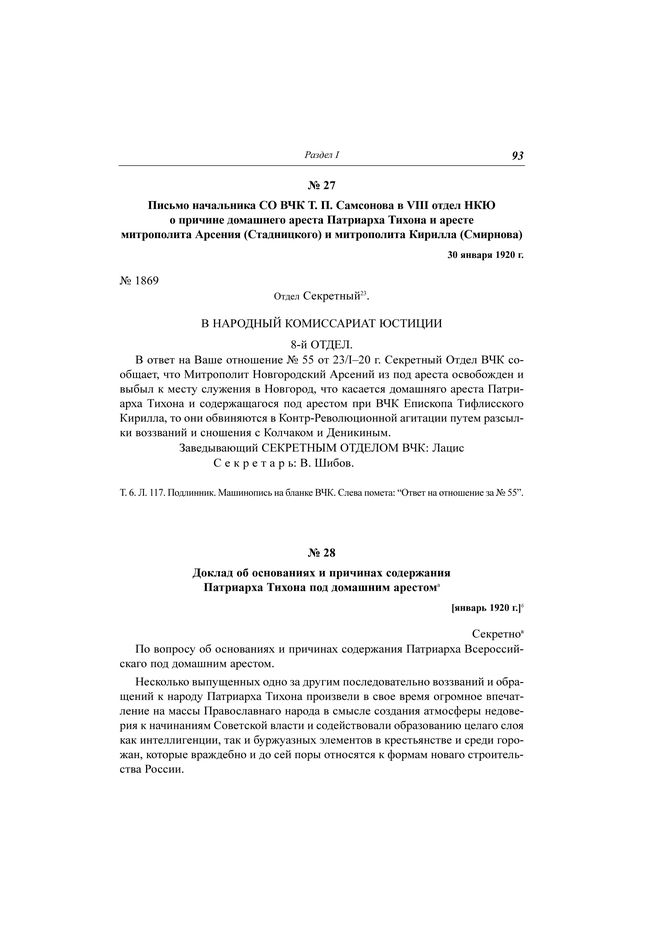 Письмо начальника СО ВЧК Т. П. Самсонова в VIII отдел НКЮ о причине домашнего ареста Патриарха Тихона и аресте митрополита Арсения (Стадницкого) и митрополита Кирилла (Смирнова), 30 января 1920 г. // ЦА ФСБ РФ. Д. Н-1780. Т. 6. Л. 117. Подлинник. Машинопись на бланке ВЧК.