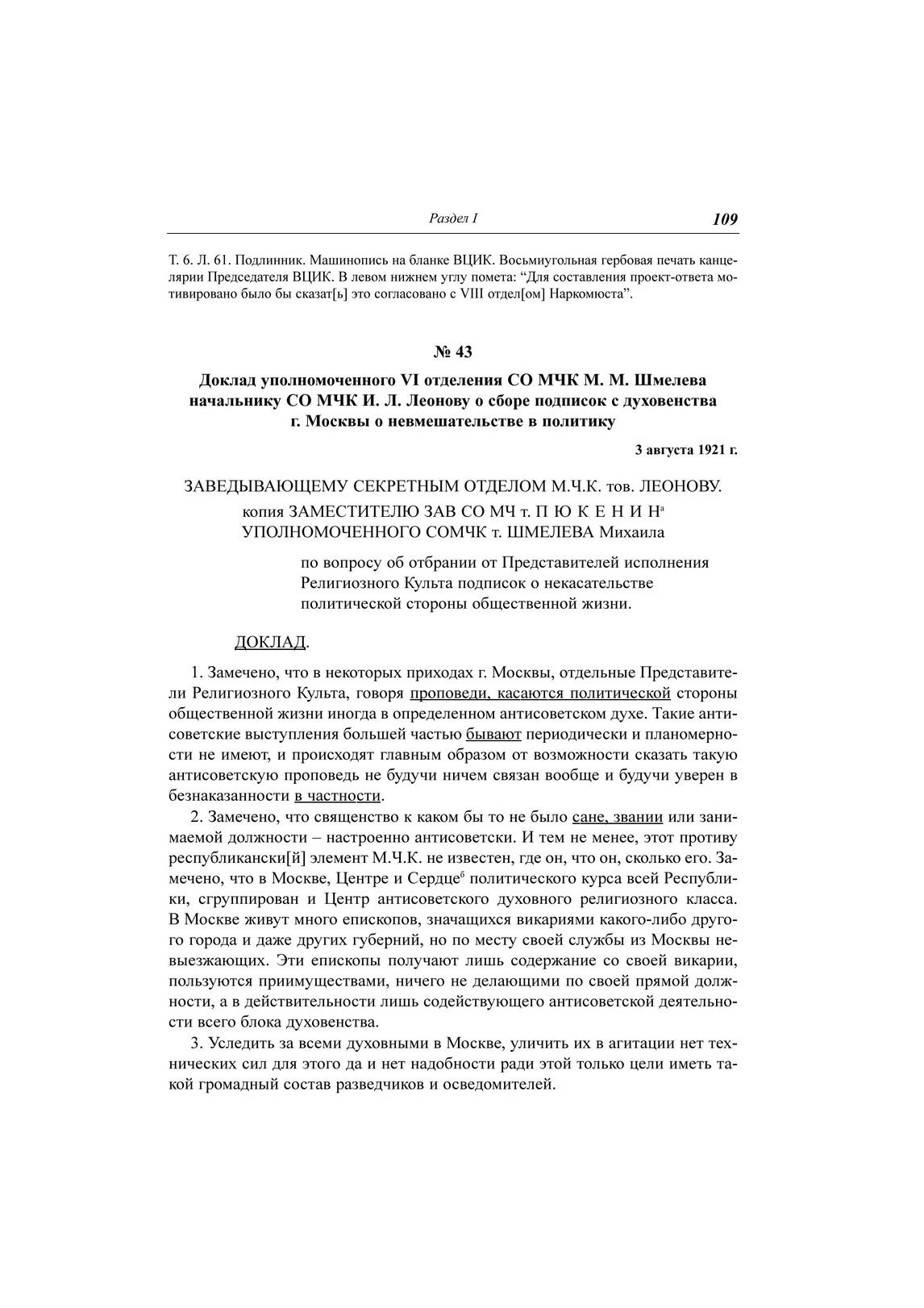 Доклад уполномоченного VI отделения СО МЧК М. М. Шмелева начальнику СО МЧК И. Л. Леонову о сборе подписок с духовенства г. Москвы о невмешательстве в политику, 3 августа 1921 г. // ЦА ФСБ РФ. Д. Н-1780. Т. 6. Л. 11-12. Подлинник. Машинопись.