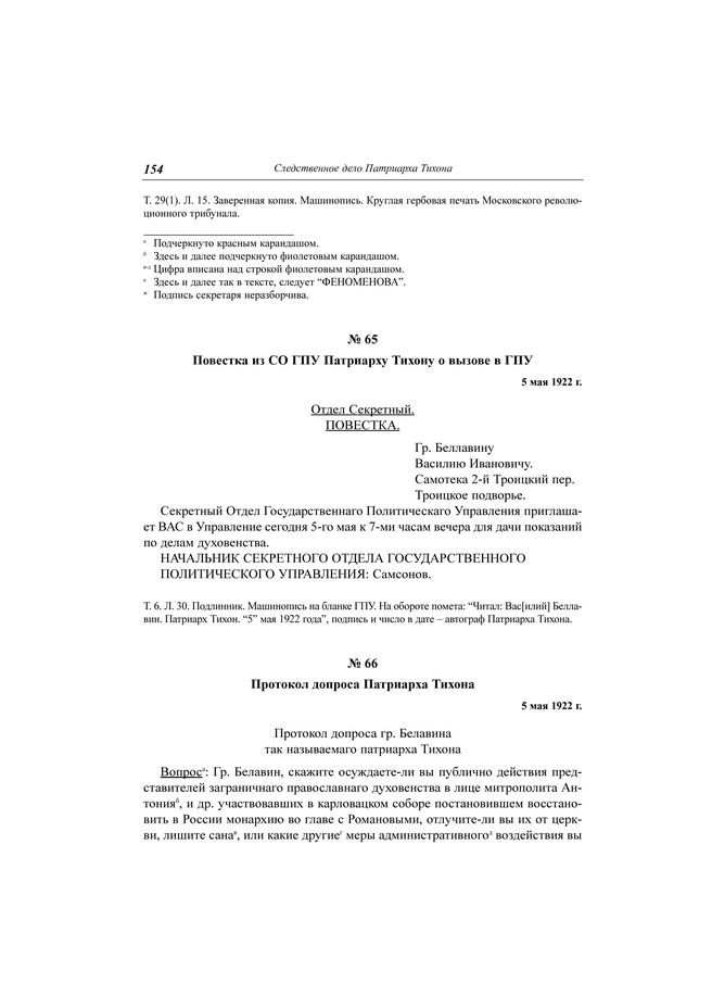 Повестка из СО ГПУ Патриарху Тихону о вызове в ГПУ, 5 мая 1922 г. // ЦА ФСБ РФ. Д. Н-1780. Т. 6. Л. 30. Подлинник. Машинопись на бланке ГПУ.