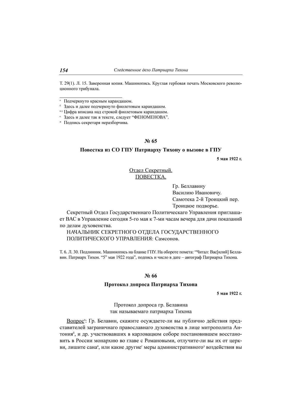 Повестка из СО ГПУ Патриарху Тихону о вызове в ГПУ, 5 мая 1922 г.