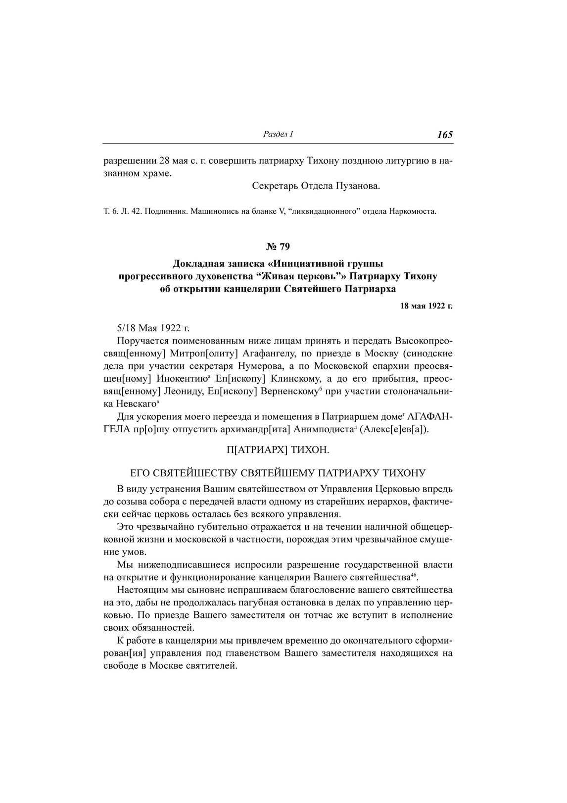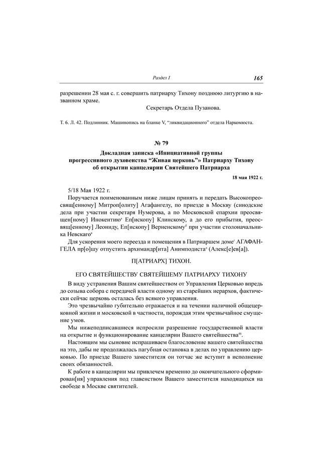 Докладная записка «Инициативной группы прогрессивного духовенства "Живая церковь"» Патриарху Тихону об открытии канцелярии Святейшего Патриарха, 18 мая 1922 г. // ЦА ФСБ РФ. Д. Н-1780. Т. 13. Л. 153. Заверенная копия. Машинопись. Штамп с формулой подписи секретаря. Число в дате проставлено рукой секретаря; Акты... С. 216.