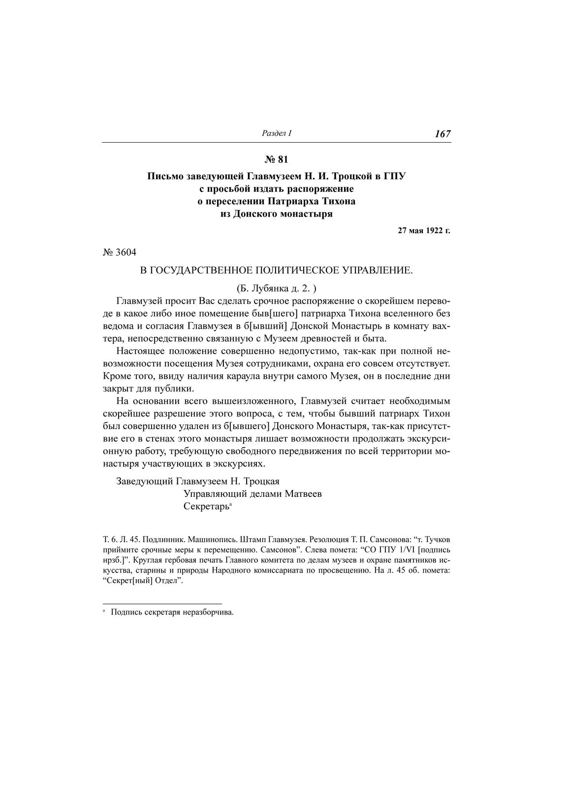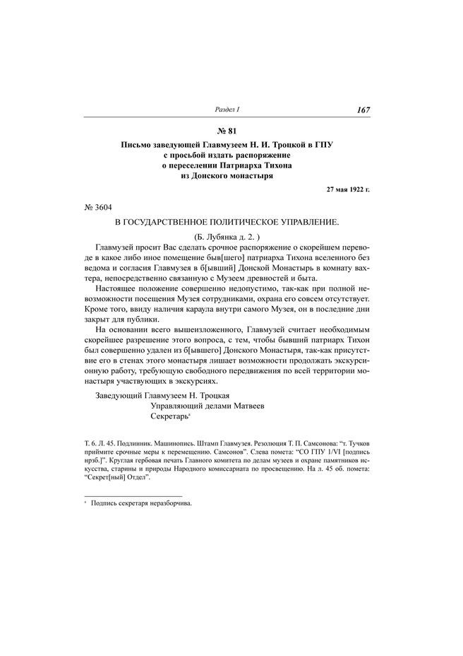 Письмо заведующей Главмузеем Н. И. Троцкой в ГПУ с просьбой издать распоряжение о переселении Патриарха Тихона из Донского монастыря, 27 мая 1922 г. // ЦА ФСБ РФ. Д. Н-1780. Т. 6. Л. 45. Подлинник. Машинопись. Штамп Главмузея.