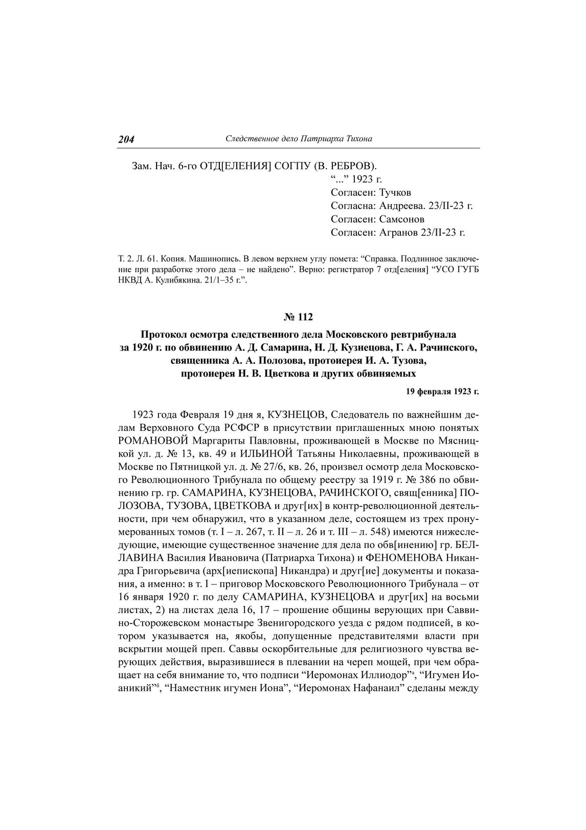 Протокол осмотра следственного дела Московского ревтрибунала за 1920 г. по обвинению А. Д. Самарина, Н. Д. Кузнецова, Г. А. Рачинского, священника А. А. Полозова, протоиерея И. А. Тузова, протоиерея Н. В. Цветкова и других обвиняемых, 19 февраля 1923 г. // ЦА ФСБ РФ. Д. Н-1780. Т. 10. Л. 257-258 об. Подлинник. Машинопись.