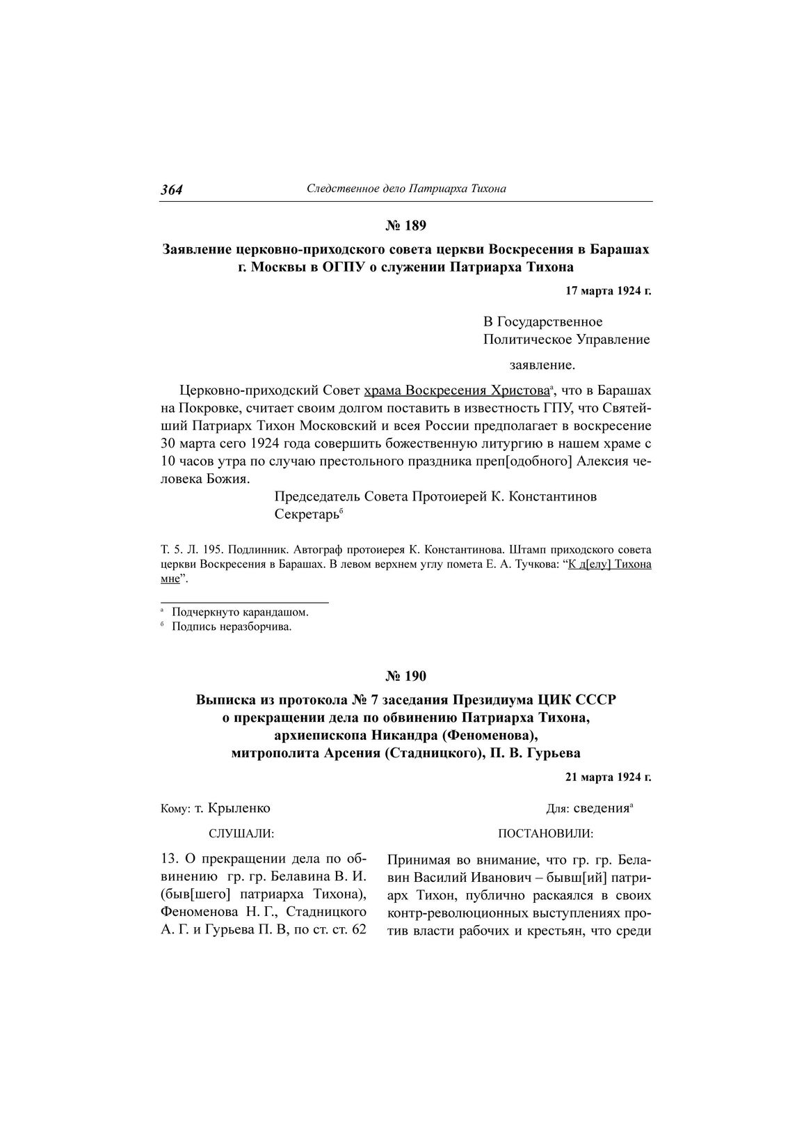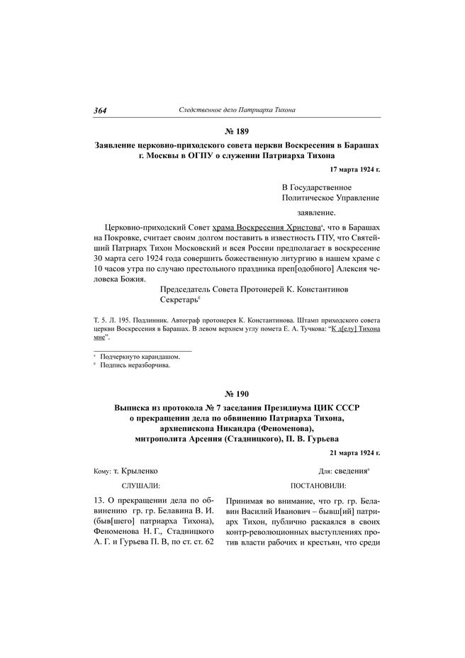Заявление церковно-приходского совета церкви Воскресения в Барашах г. Москвы в ОГПУ о служении Патриарха Тихона, 17 марта 1924 г. // ЦА ФСБ РФ. Д. Н-1780. Т. 5. Л. 195. Подлинник. Автограф протоиерея К. Константинова. Штамп приходского совета церкви Воскресения в Барашах.