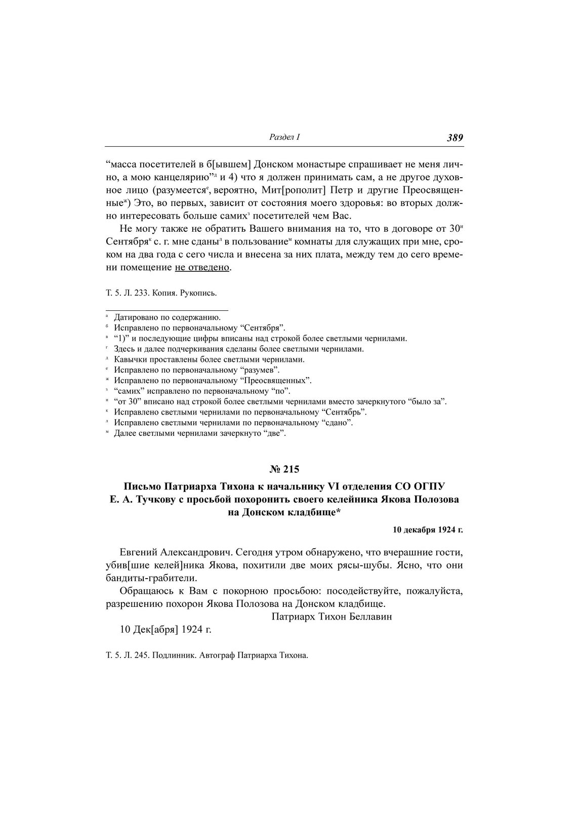Письмо Патриарха Тихона к начальнику VI отделения СО ОГПУ Е. А. Тучкову с просьбой похоронить своего келейника Якова Полозова на Донском кладбище, 10 декабря 1924 г. // ЦА ФСБ РФ. Д. Н-1780. Т. 5. Л. 245. Подлинник. Автограф Патриарха Тихона.