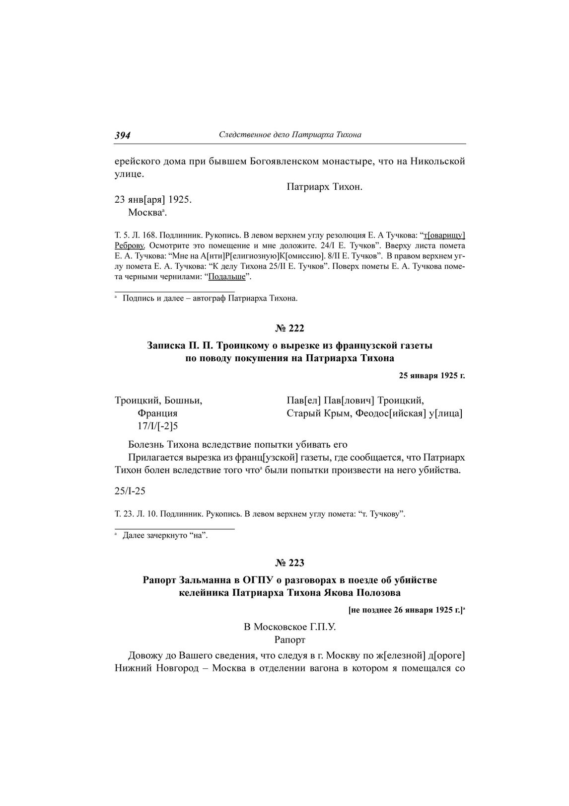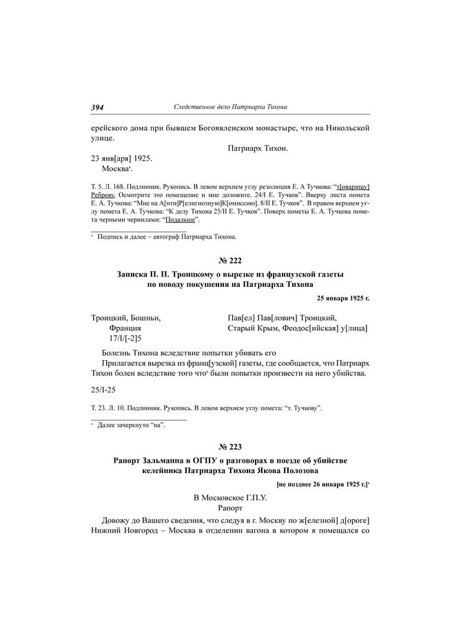 Рапорт Зальманна в ОГПУ о разговорах в поезде об убийстве келейника Патриарха Тихона Якова Полозова. [Не позднее 26 января 1925 г.] // ЦА ФСБ РФ. Д. Н-1780. Т. 5. Л. 263 - 263 об. Подлинник. Автограф Зальманна.