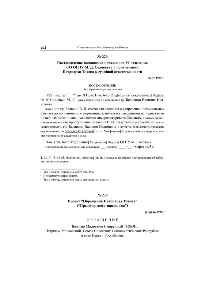 Постановление помощника начальника VI отделения СО ОГПУ М. Д. Соловьева о привлечении Патриарха Тихона к судебной ответственности, март 1925 г.