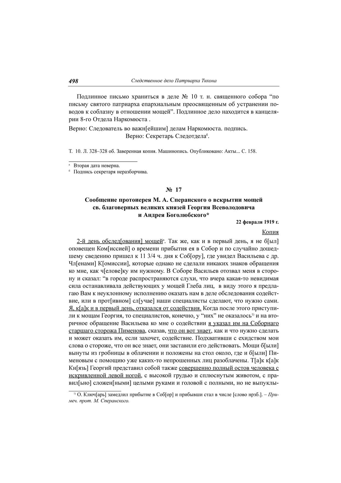 Сообщение протоиерея М. А. Сперанского о вскрытии мощей св. благоверных великих князей Георгия Всеволодовича и Андрея Боголюбского, 22 февраля 1919 г. // ЦА ФСБ РФ. Д. Н-1780. Т. 10. Л. 165-166 об. Заверенная копия. Рукопись.