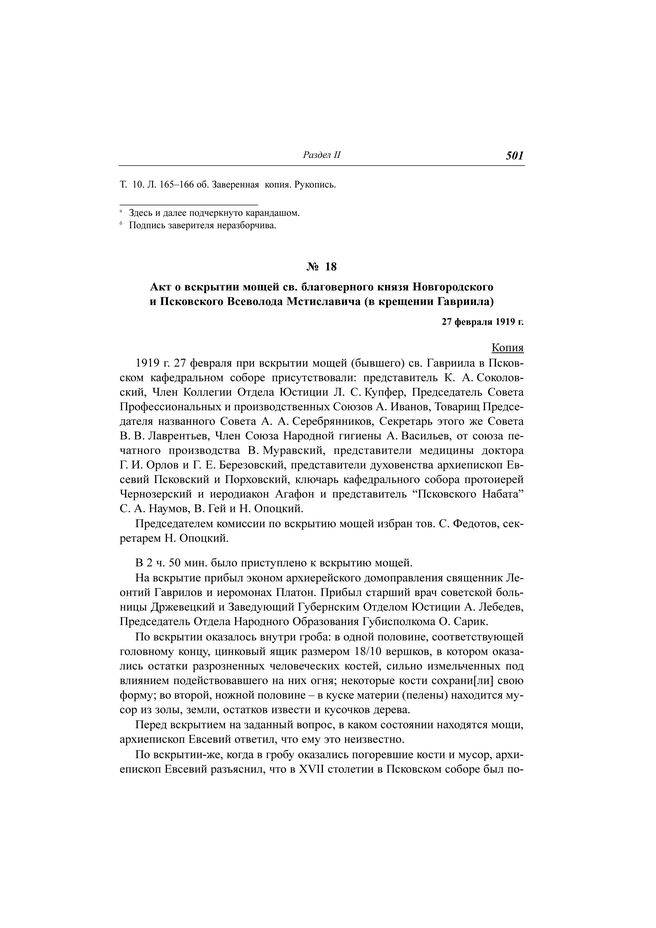 Акт о вскрытии мощей св. благоверного князя Новгородского и Псковского Всеволода Мстиславича (в крещении Гавриила), 27 февраля 1919 г. // ЦА ФСБ РФ. Д. Н-1780. Т. 10. Л. 174-174 об. Заверенная копия. Машинопись. Круглая печать Псковского губисполкома.
