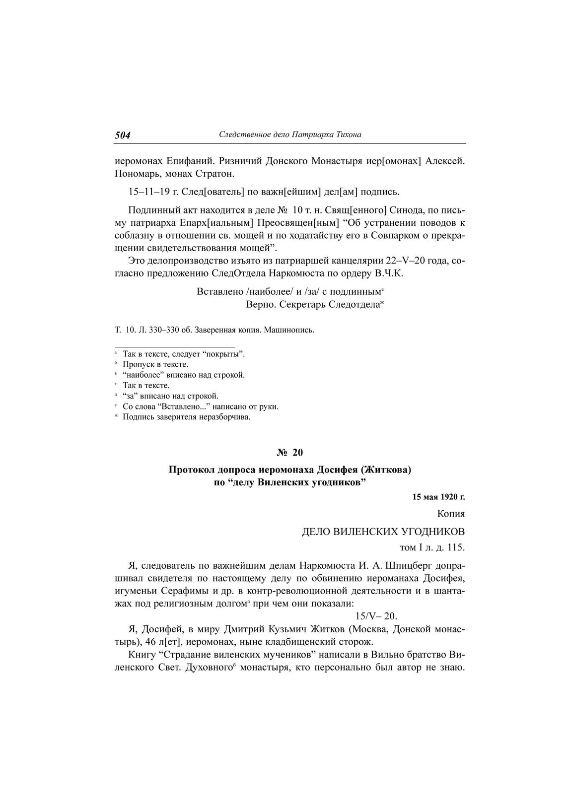 Протокол допроса иеромонаха Досифея (Житкова) по "делу Виленских угодников", 15 мая 1920 г. // ЦА ФСБ РФ. Д. Н-1780. Т. 10. Л. 331-331 об. Заверенная копия. Машинопись.
