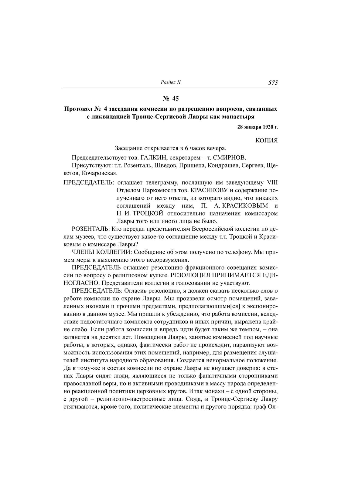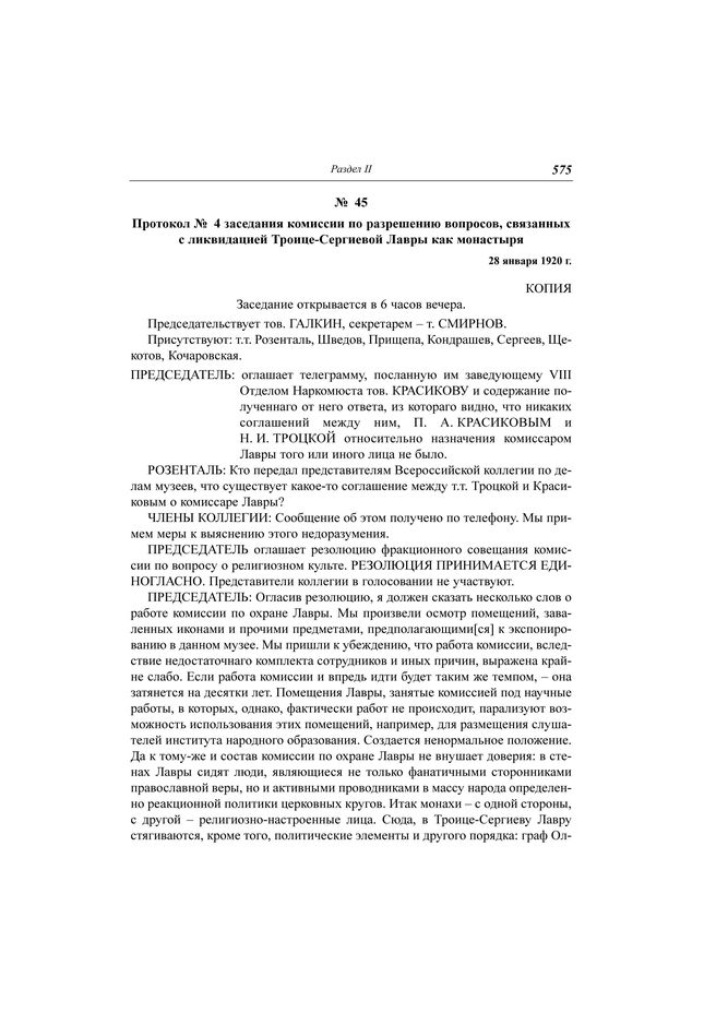 Протокол № 4 заседания комиссии по разрешению вопросов, связанных с ликвидацией Троице-Сергиевой Лавры как монастыря, 28 января 1920 г. // ЦА ФСБ РФ. Д. Н-1780. Т. 11. Ч. 1. Л. 44-46. Копия. Машинопись.