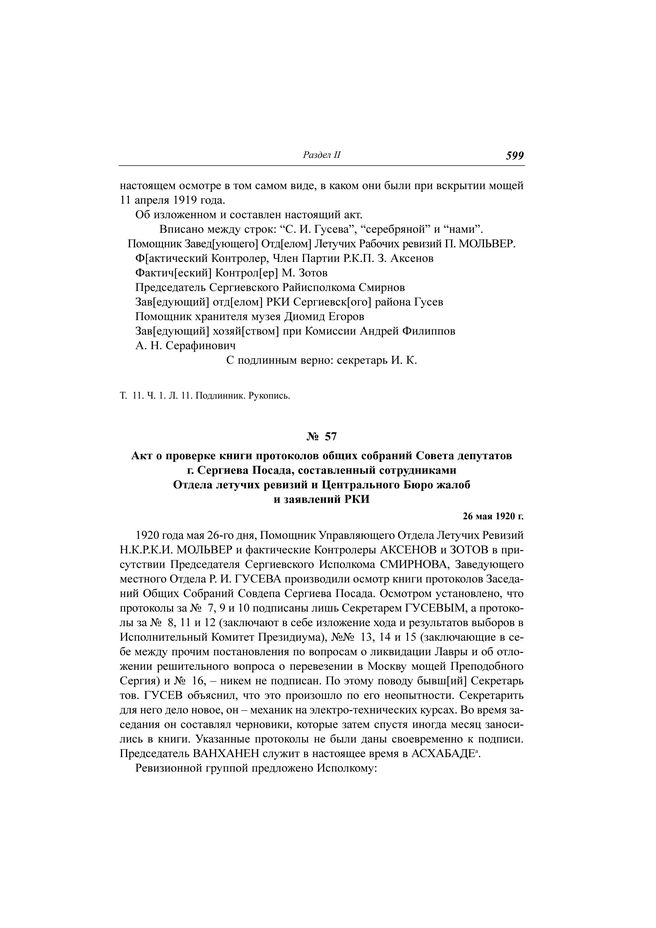 Акт о проверке книги протоколов общих собраний Совета депутатов г. Сергиева Посада, составленный сотрудниками Отдела летучих ревизий и Центрального бюро жалоб и заявлений РКИ, 26 мая 1920 г. // ЦА ФСБ РФ. Д. Н-1780. Т. 11. Ч. 1. Л. 28. Подлинник. Рукопись.
