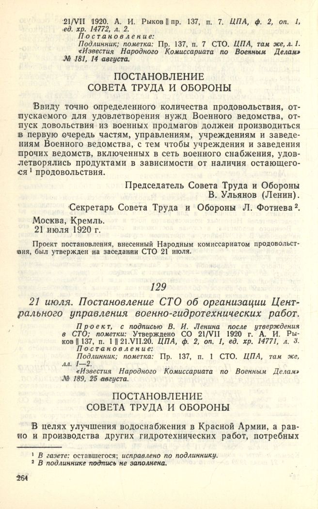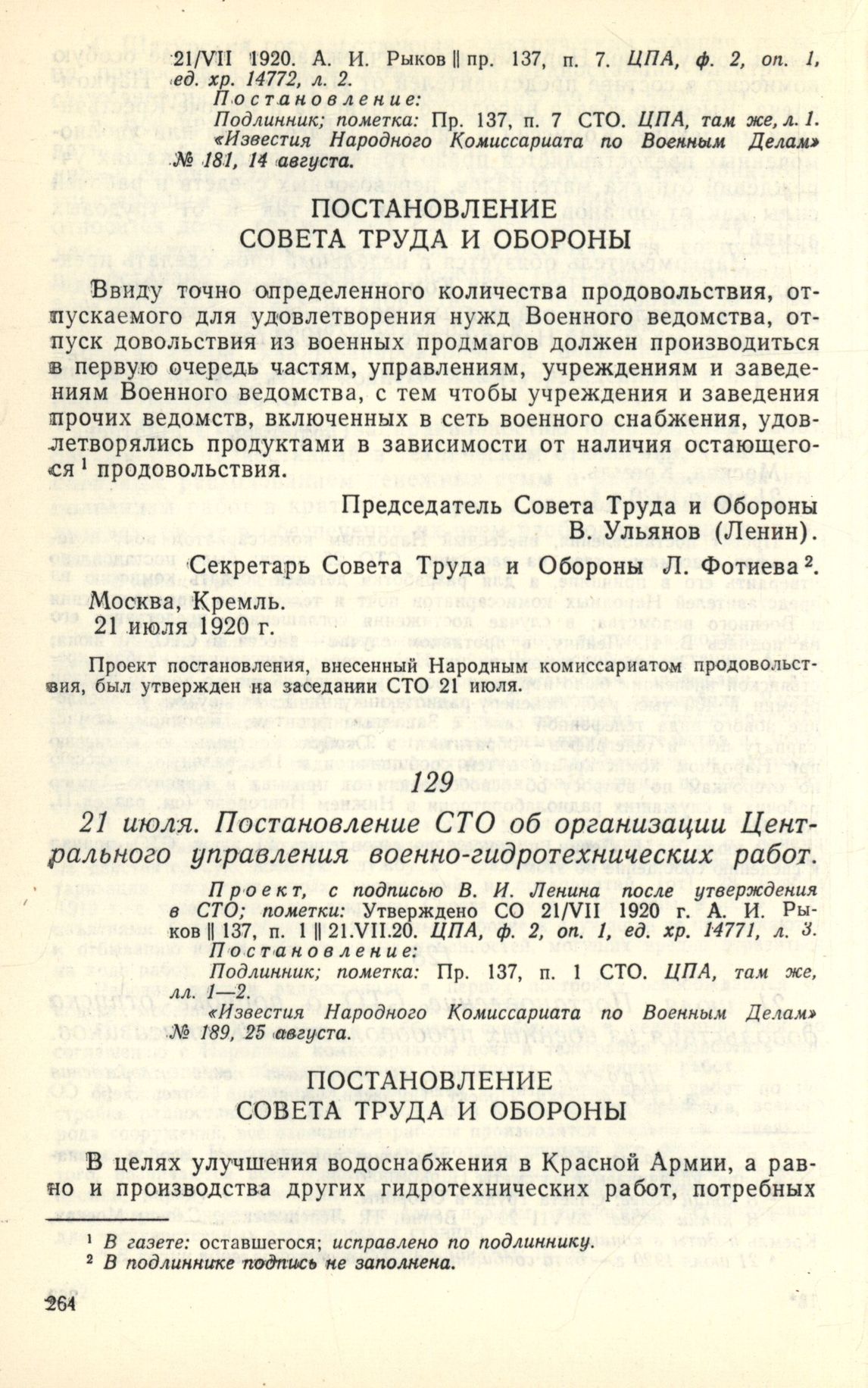 21 июля. Постановление СТО об организации Центрального управления военно-гидротехнических работ // Проект, с подписью В. И. Ленина после утверждения в СТО; пометки: Утверждено СО 21/VII 1920 г. А. И. Рыков || 137, п. 1 || 21.VII.20. ЦПА, ф. 2, оп. 1, ед. хр. 14771, л. 8. Постановление: Подлинник; пометка: Пр. 137, п. 1 СТО. ЦПА, там же, лл. 1—2. «Известия Народного Комиссариата по Военным Делам» № 189, 25 августа.