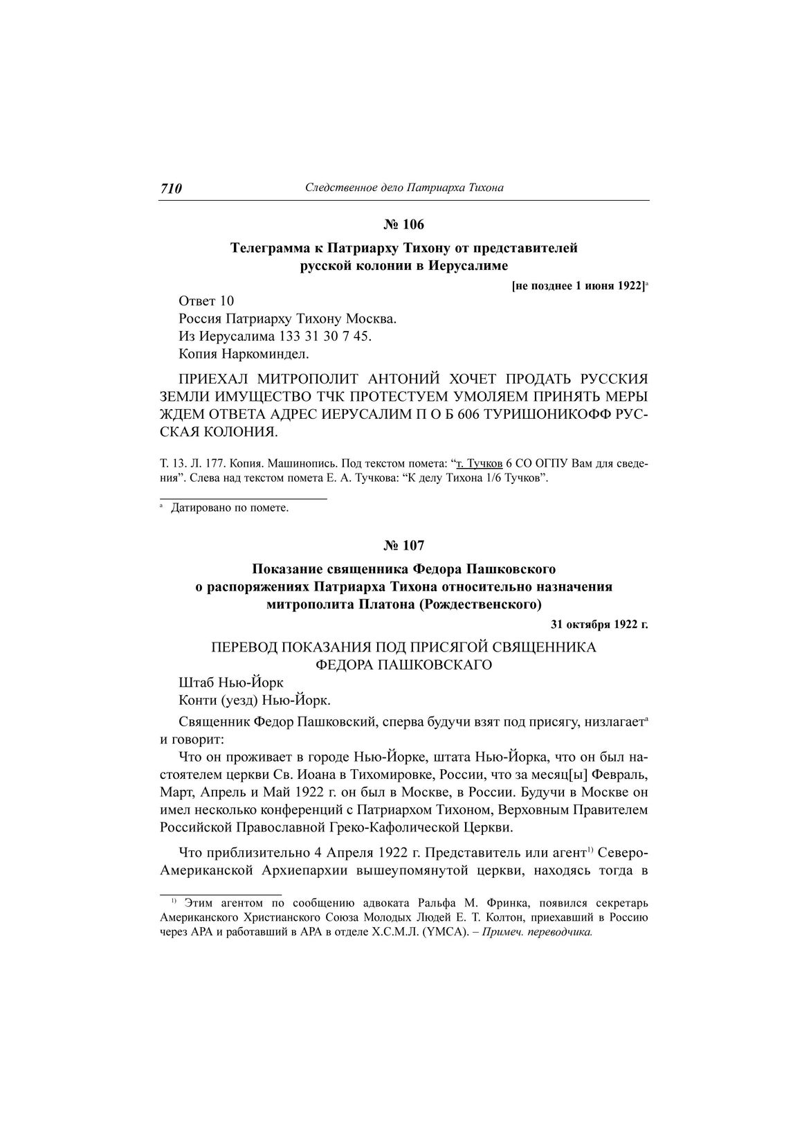 Показание священника Федора Пашковского о распоряжениях Патриарха Тихона относительно назначения митрополита Платона (Рождественского), 31 октября 1922 г. // ЦА ФСБ РФ. Д. Н-1780. Т. 27. Л. 9-9 об. Копия. Машинопись. Перевод с англ.