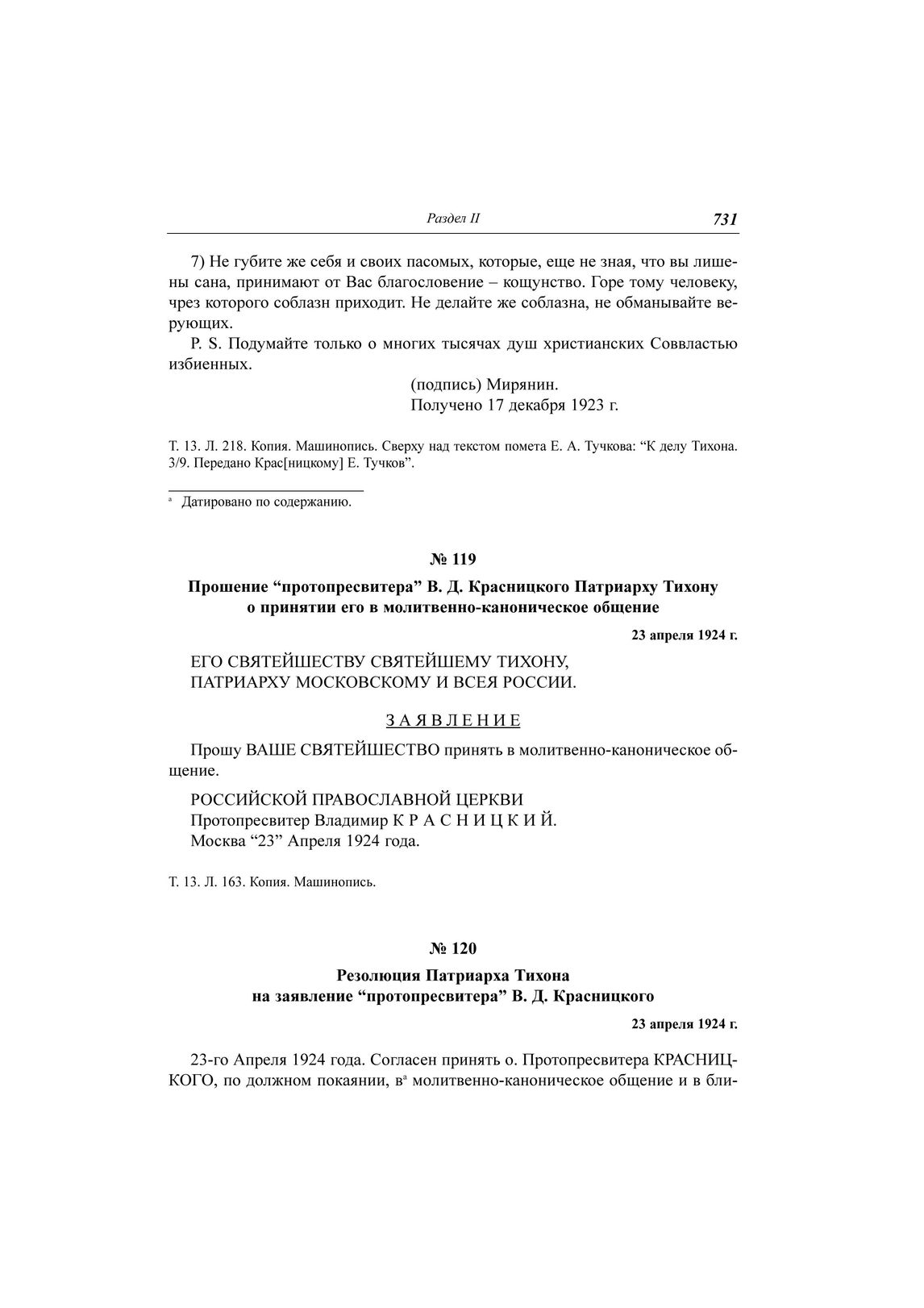 Прошение "протопресвитера" В. Д. Красницкого Патриарху Тихону о принятии его в молитвенно-каноническое общение, 23 апреля 1924 г. // ЦА ФСБ РФ. Д. Н-1780. Т. 13. Л. 163. Копия. Машинопись.