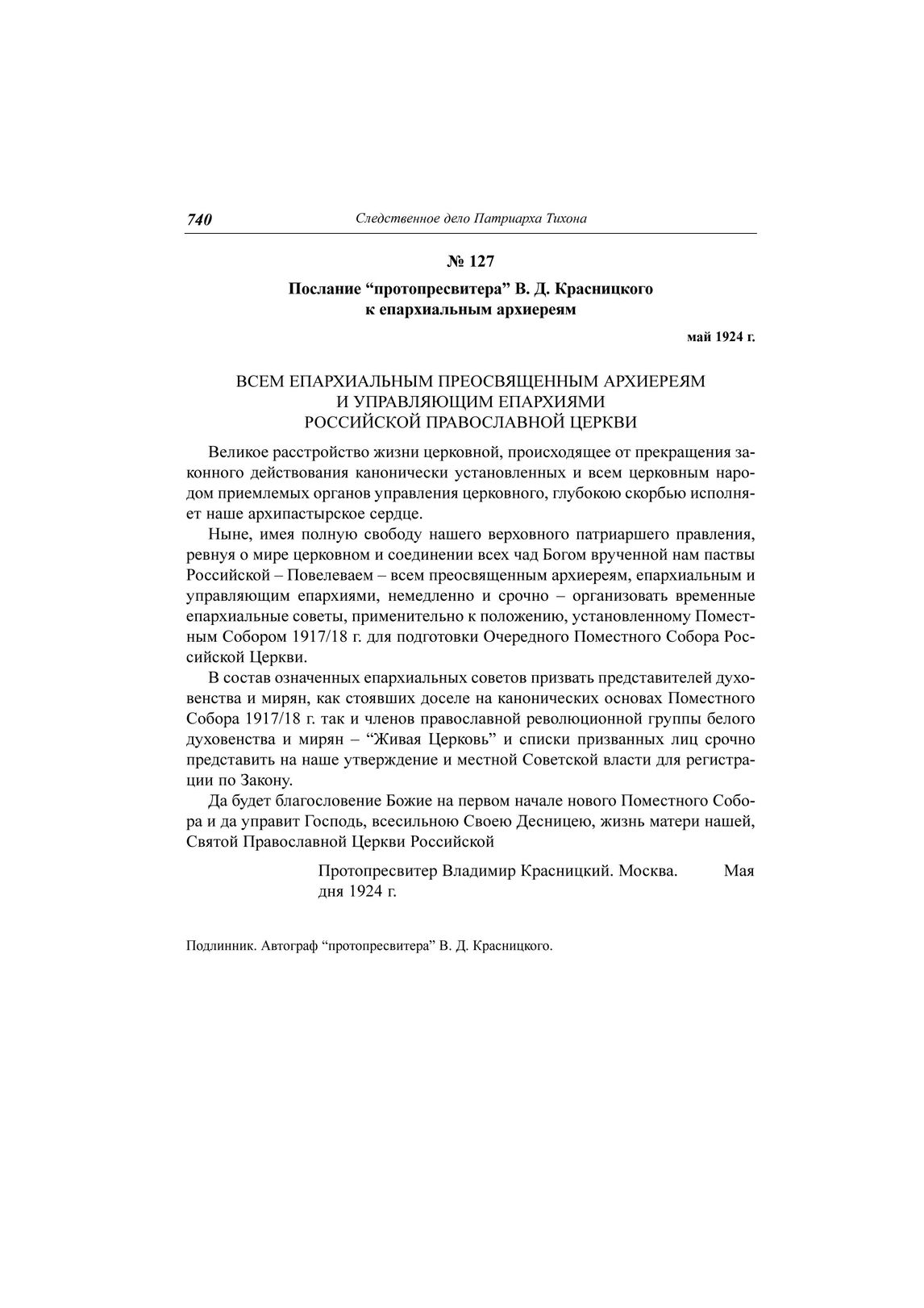 Послание "протопресвитера" В. Д. Красницкого к епархиальным архиереям, май 1924 г.