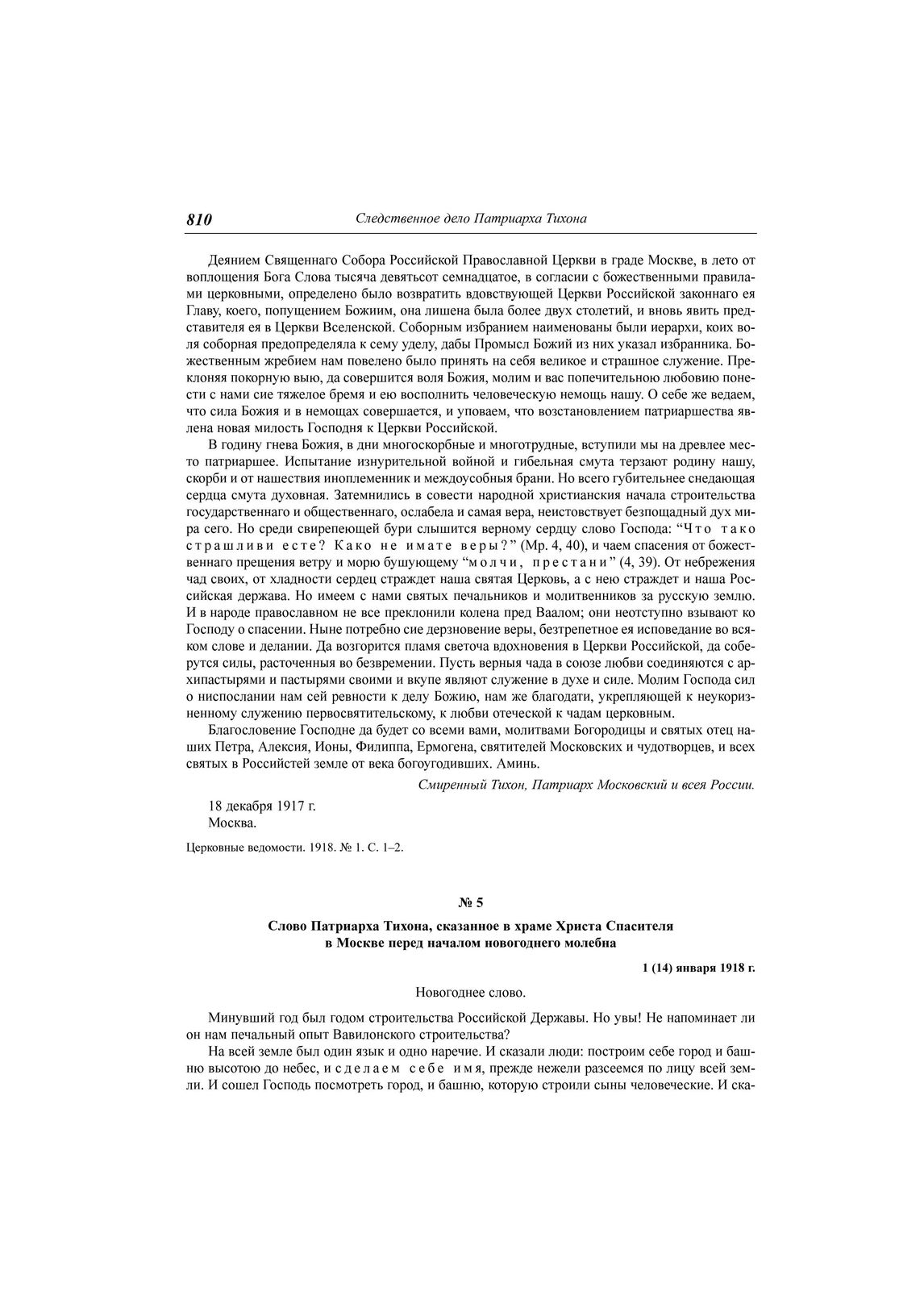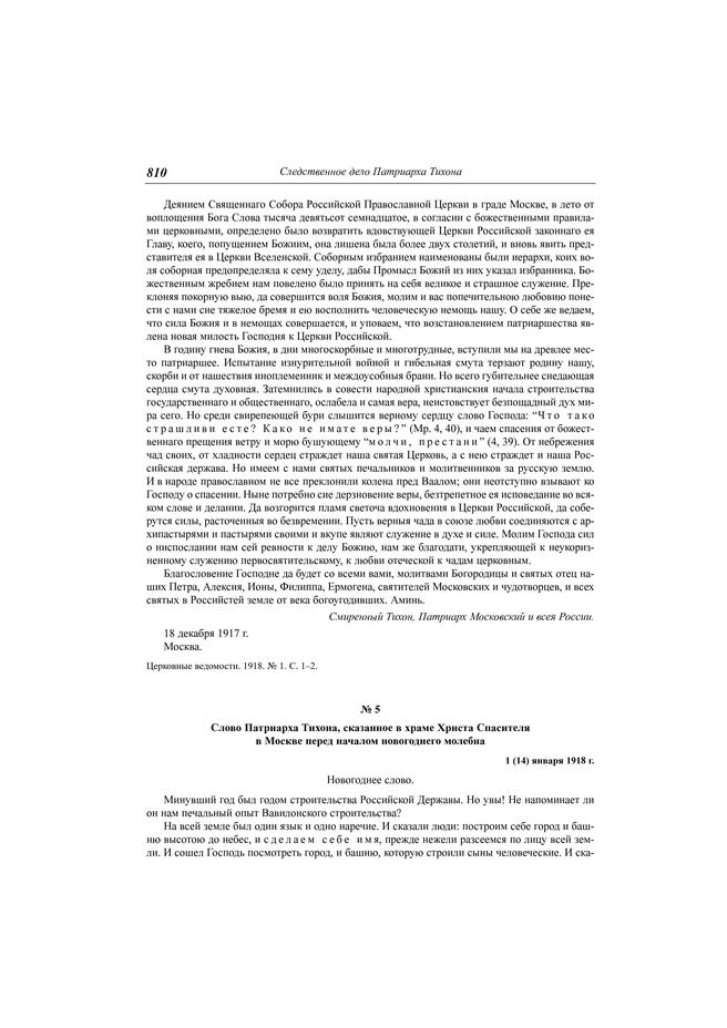 Слово Патриарха Тихона, сказанное в храме Христа Спасителя в Москве перед началом новогоднего молебна, 1 (14) января 1918 г. // Прибавление к "Церковным ведомостям". 1918. № 1.