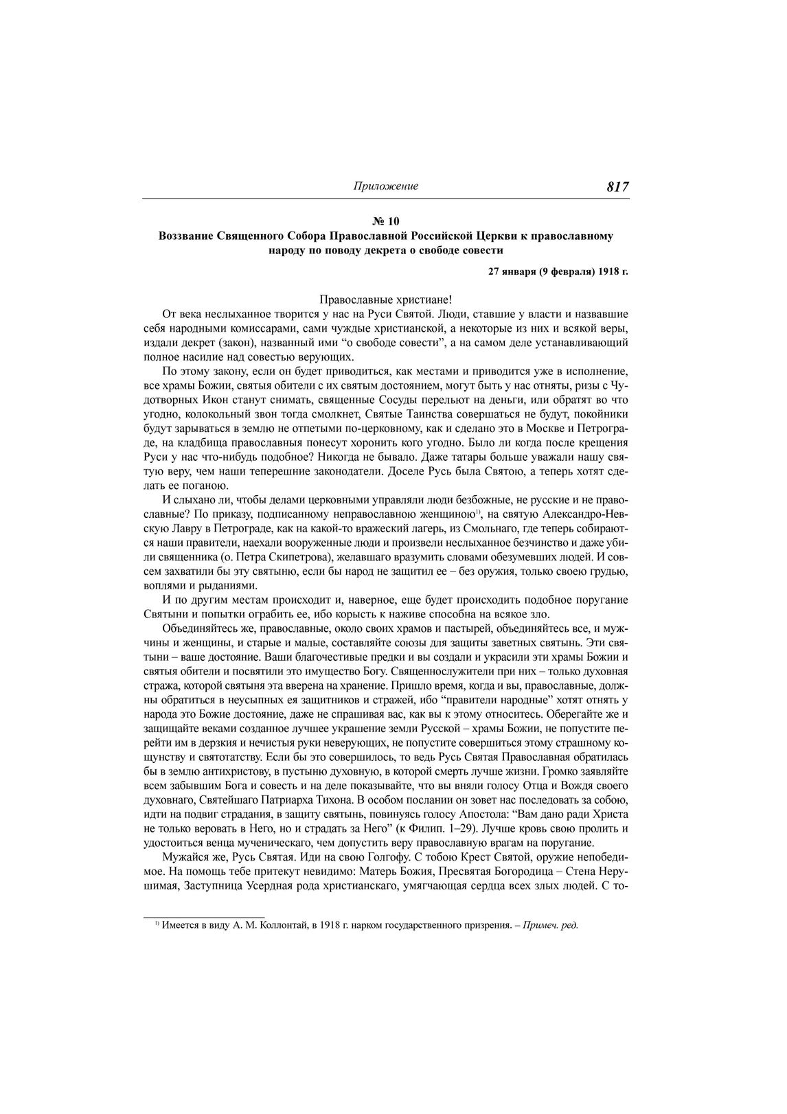 Воззвание Священного Собора Православной Российской Церкви к православному народу по поводу декрета о свободе совести, 27 января (9 февраля) 1918 г. // Церковные ведомости. 1918. № 3/4. С. 19-20.