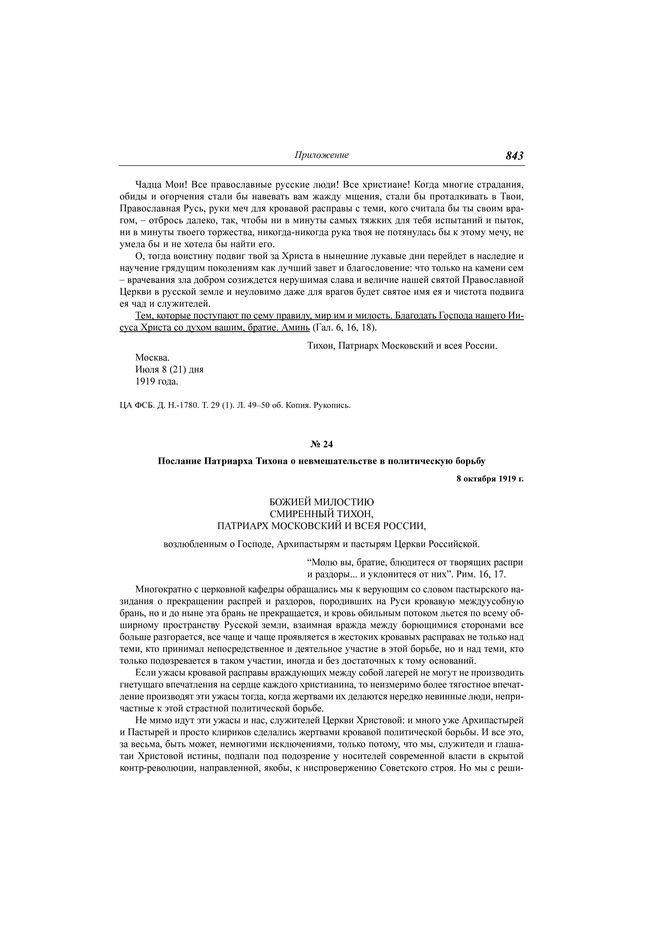 Послание Патриарха Тихона о невмешательстве в политическую борьбу, 8 октября 1919 г. // ЦА ФСБ. Д. Н.-1780. Т. 29. Л. 57-58. Листовка.