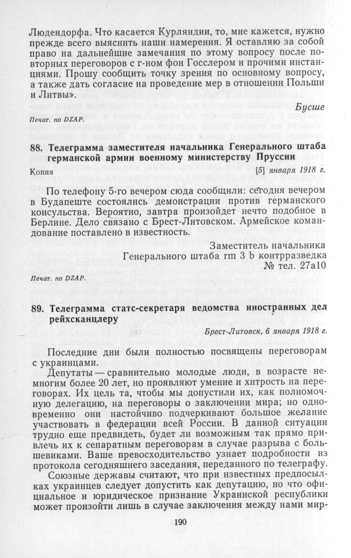Телеграмма заместителя начальника Генерального штаба германской армии военному министерству Пруссии. [5] января 1918 г. // Печат. пo DZAP.