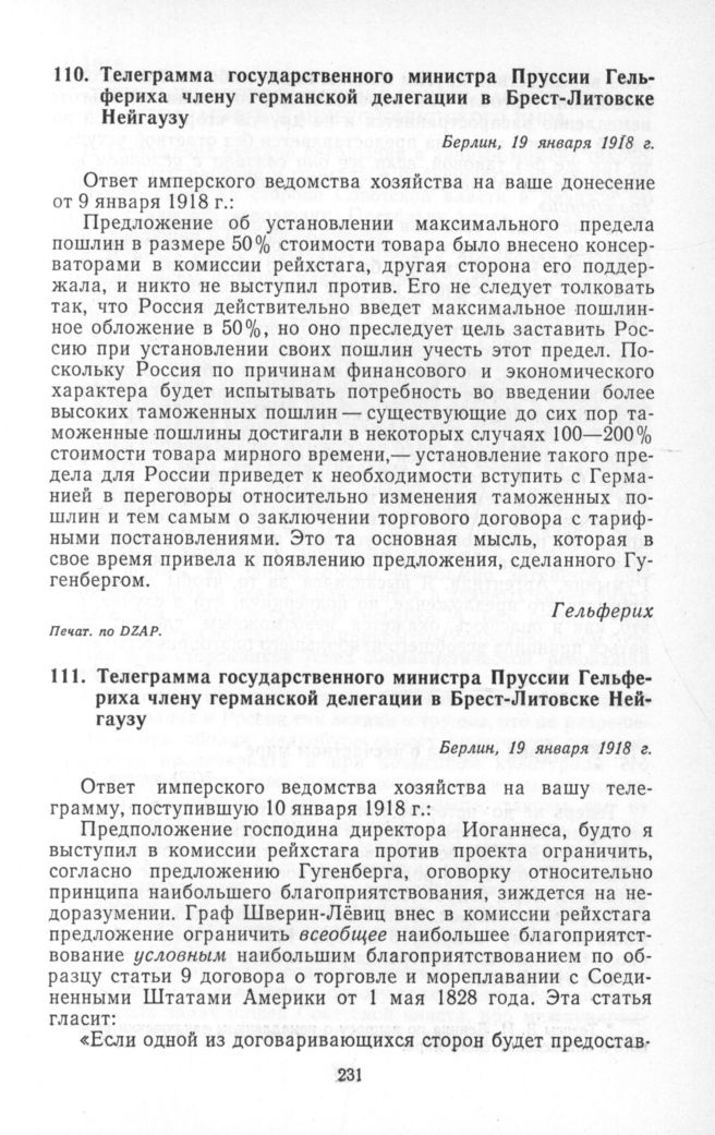 Телеграмма государственного министра Пруссии Гельфериха члену германской делегации в Брест-Литовске Нейгаузу. Берлин, 19 января 1918 г. // Печат. пo DZAP.