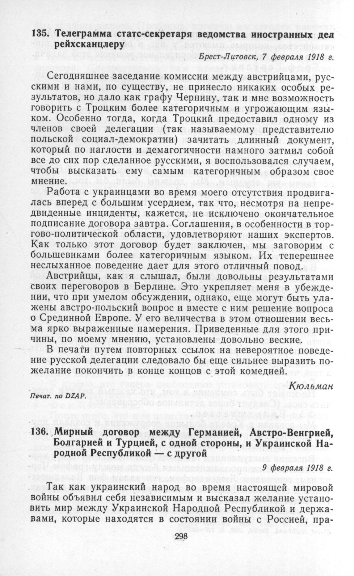 Телеграмма статс-секретаря ведомства иностранных дел рейхсканцлеру. Брест-Литовск, 7 февраля 1918 г. // Печат. пo DZAP.