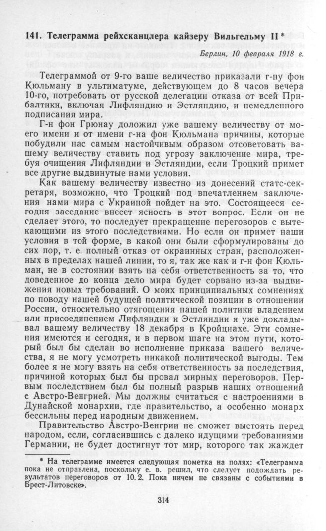 Телеграмма рейхсканцлера кайзеру Вильгельму II [1]. Берлин, 10 февраля 1918 г. // Печат. пo DZAP.
