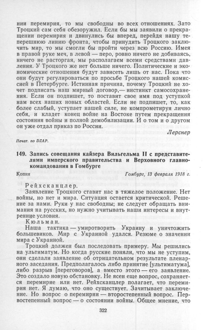 Запись совещания кайзера Вильгельма II с представителями имперского правительства и Верховного главнокомандования в Гомбурге. Гомбург, 13 февраля 1918 г. // Печат. пo DZAP.