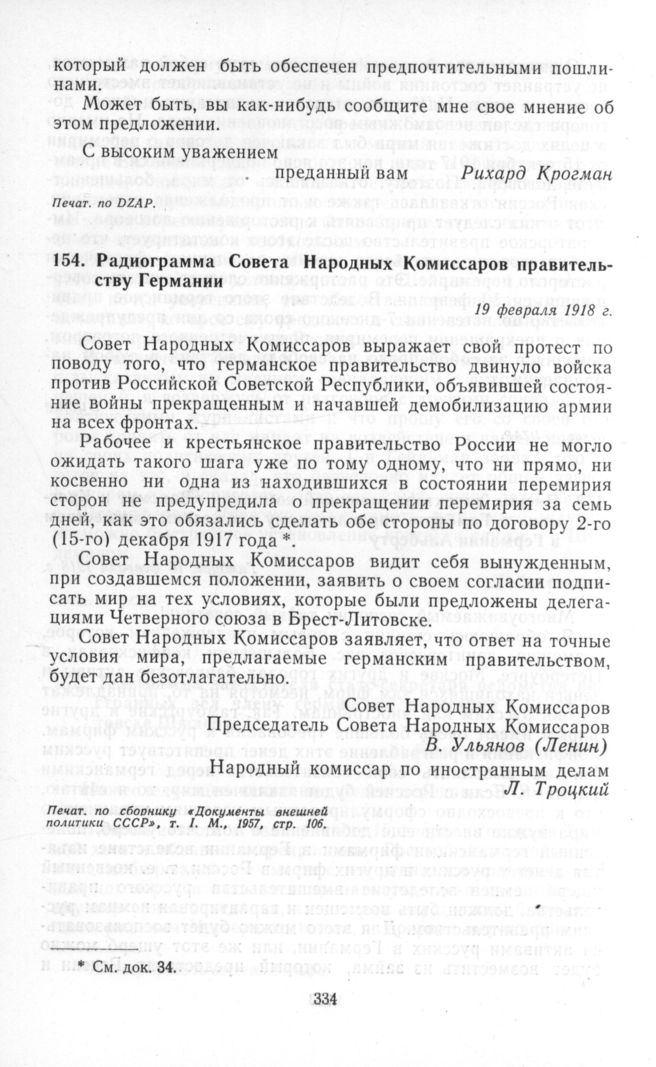 Радиограмма Совета Народных Комиссаров правительству Германии. 19 февраля 1918 г. // «Документы внешней политики СССР», т. I. М., 1957, стр. 106.
