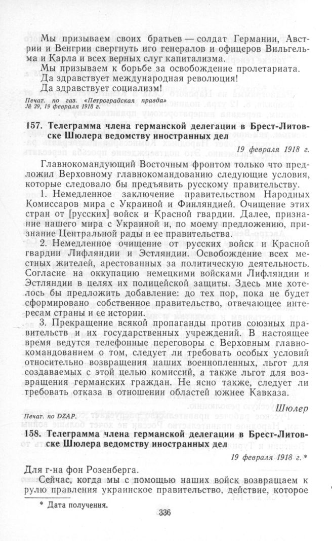 Телеграмма члена германской делегации в Брест-Литовске Шюлера ведомству иностранных дел. 19 февраля 1918 г. // Печат. пo DZAP.